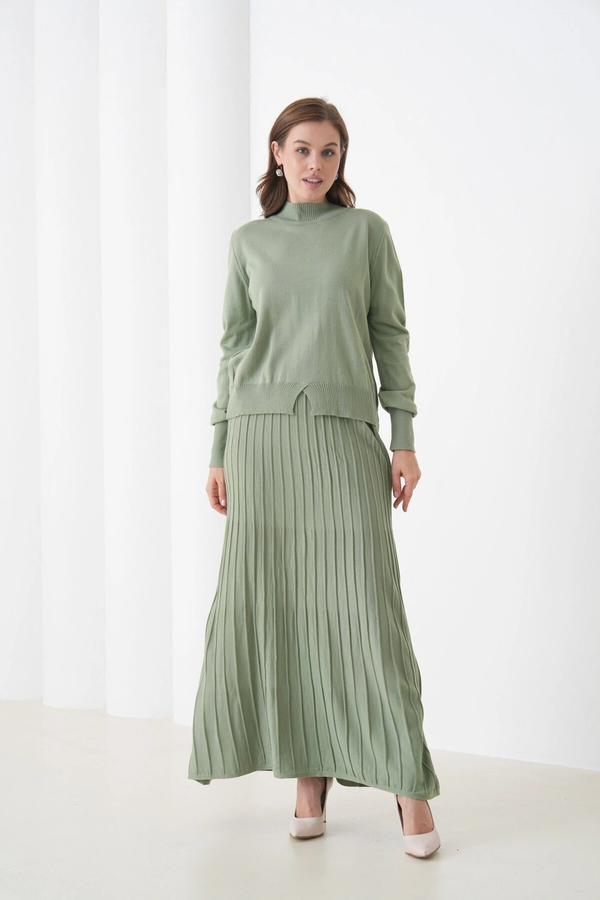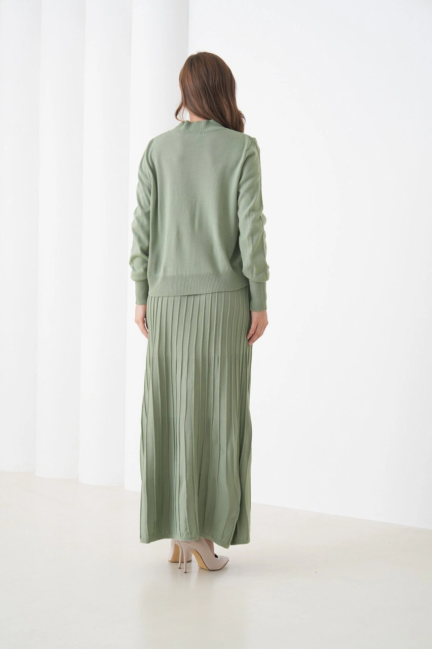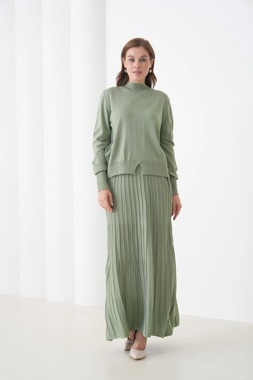 Kadın Pileli Etek Kazağı V Tasarım Tesettüre Uygun Örgü Triko Etek Kazak Takım Mint Yeşili
