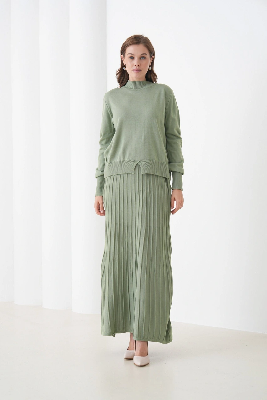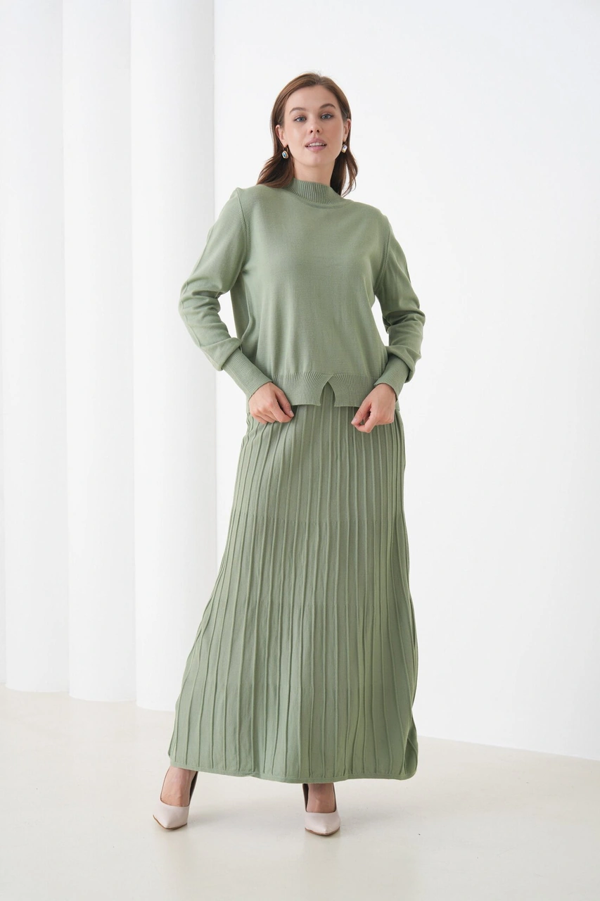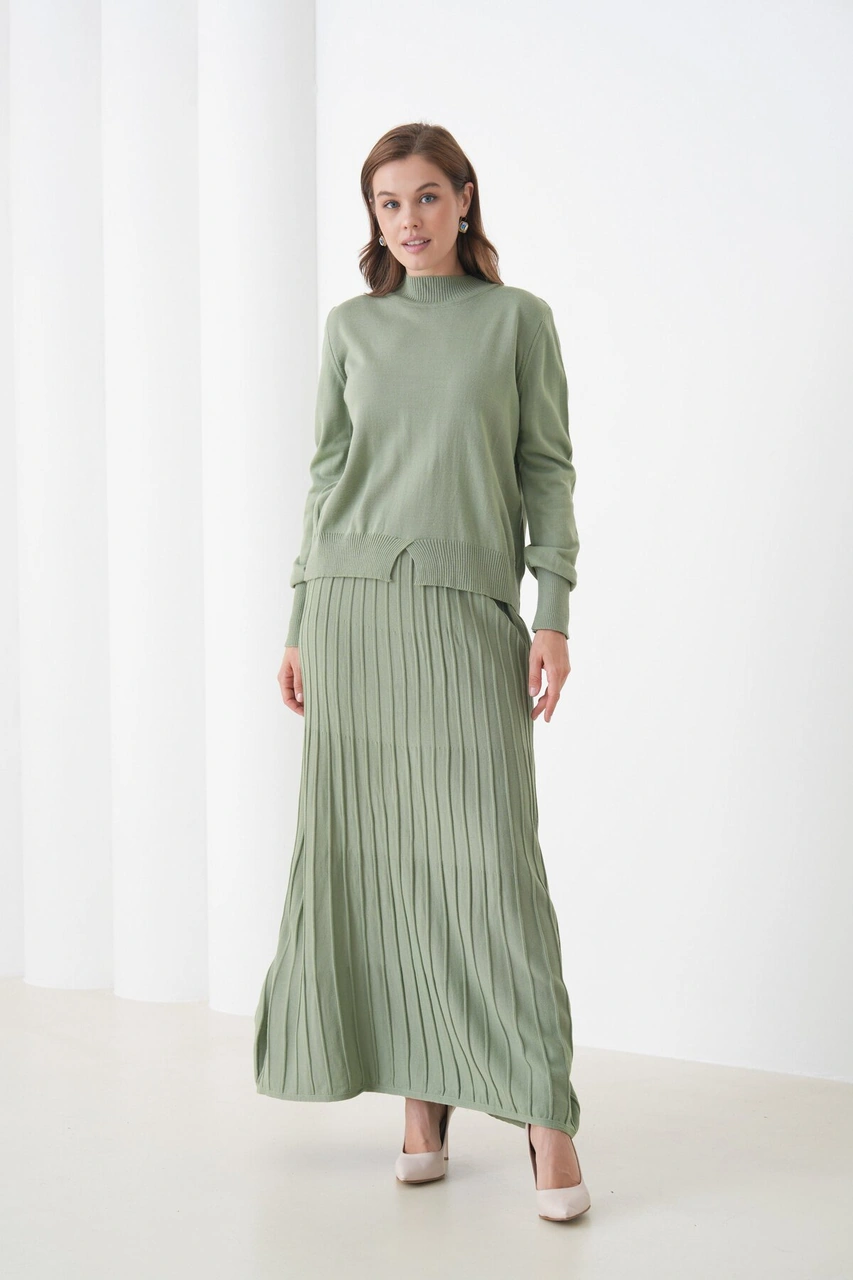 Kadın Pileli Etek Kazağı V Tasarım Tesettüre Uygun Örgü Triko Etek Kazak Takım Mint Yeşili