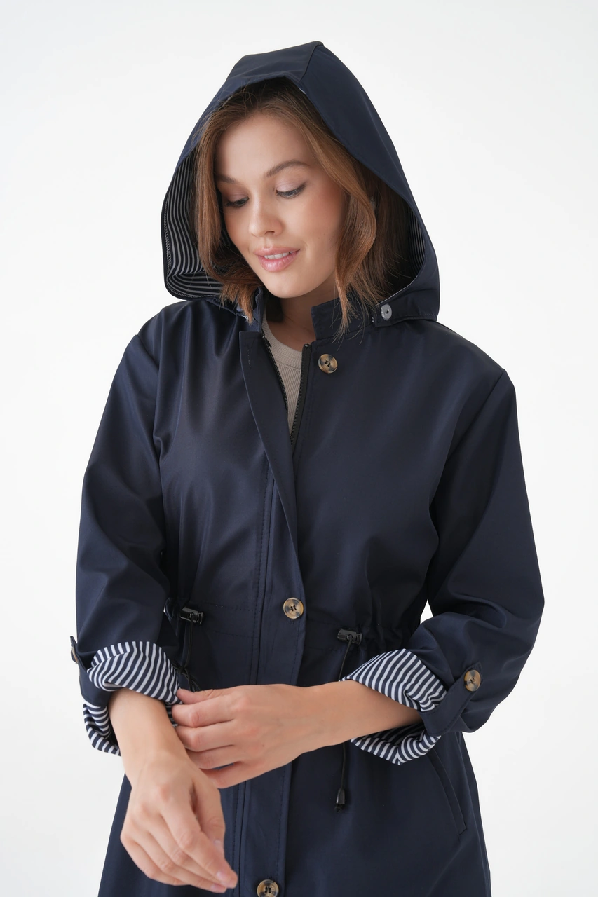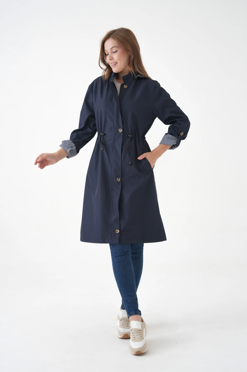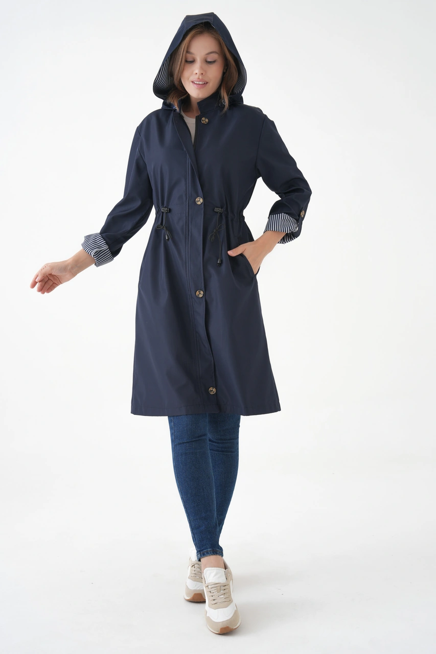 Kadın Rüzgar Ve Su Geçirmez Bondit Kumaş Çıkarılabilir Düğmeli Kapüşon Beli Tünelli Mevsimlik Trençkot Lacivert