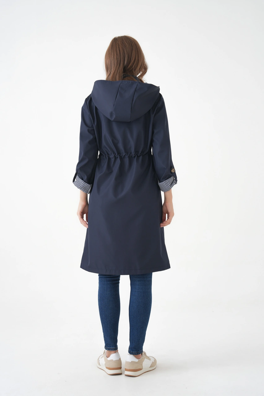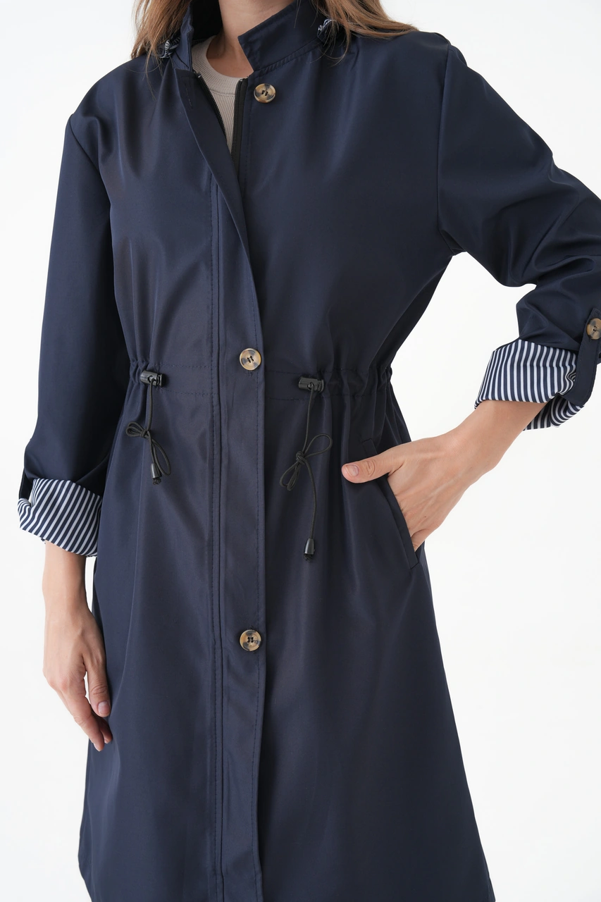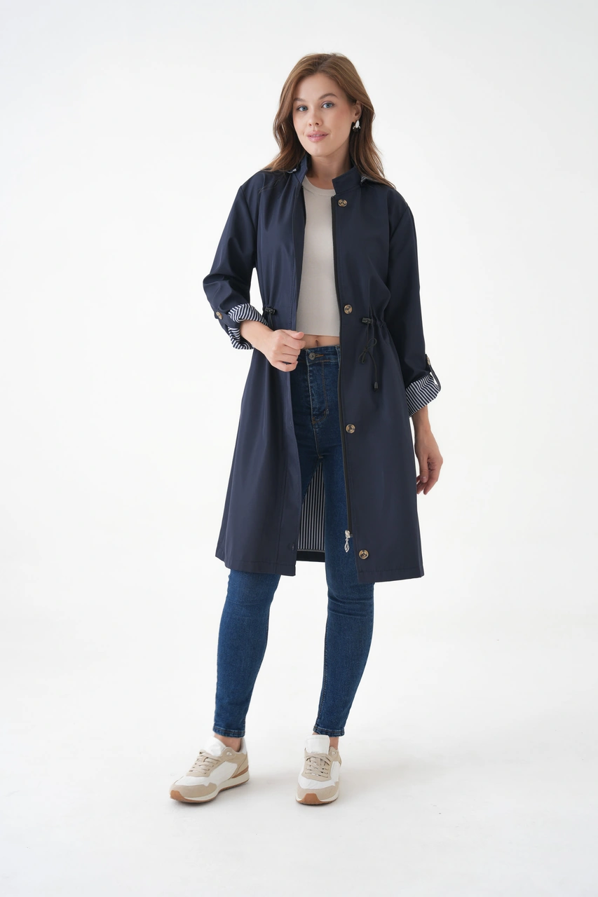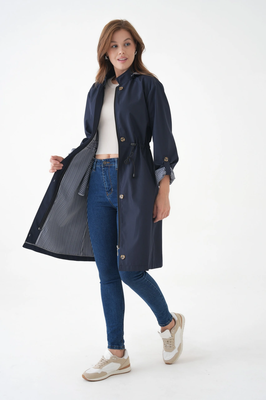 Kadın Rüzgar Ve Su Geçirmez Bondit Kumaş Çıkarılabilir Düğmeli Kapüşon Beli Tünelli Mevsimlik Trençkot Lacivert