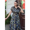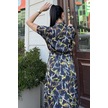 Kadın Siyah Desenli, Yarım Kol Ve Yarım Patlı Gömlek Yaka, Beli Lastikli, Salaş Uzun Saten Elbise Siyah