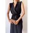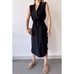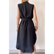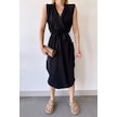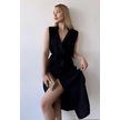 Kadın Siyah Kalın Askılı, Kruvaze Yaka, Düz Desen, Aerobin Yırtmaçlı, Kemerli Midi Elbise Siyah