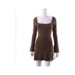 Kadın Sonbahar Ve Kış Yeni İpli Uzun Kollu Düz Renk Kare Yaka Dar Kesim Yüksek Bel Yırtmaçlı Elbiseler Kahverengi