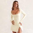 Kadın Sonbahar Ve Kış Yeni İpli Uzun Kollu Düz Renk Kare Yaka Dar Kesim Yüksek Bel Yırtmaçlı Elbiseler Kayısı