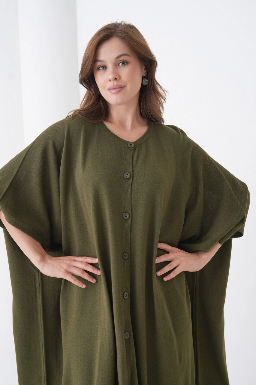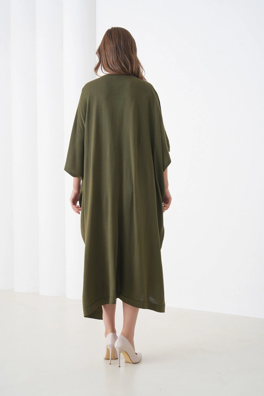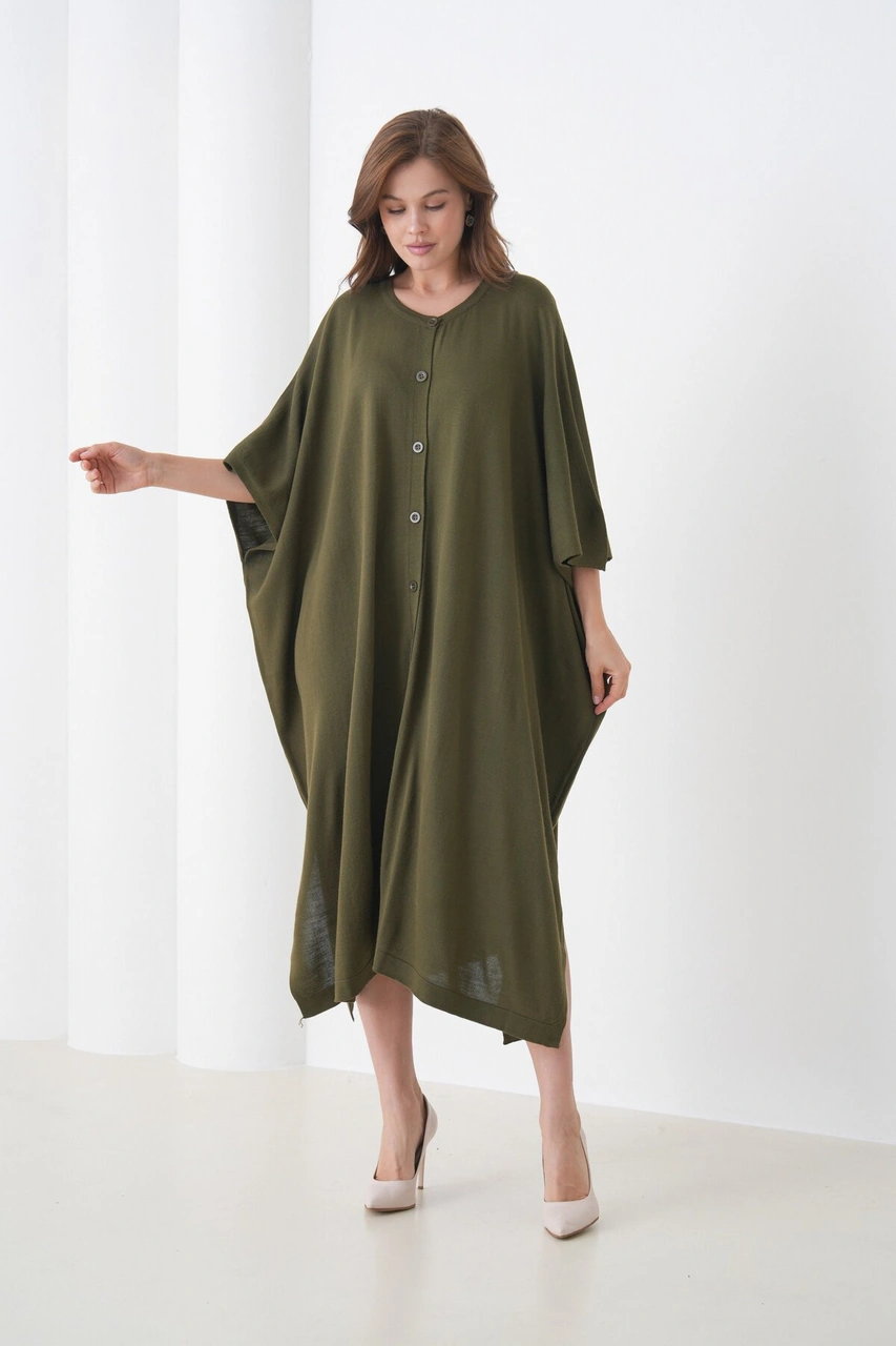 Kadın Tesettüre Uygun Önden Düğmeli Asimetrik Kesim Yarasa Kol Şık Geniş Kalıp Panço Ceket Haki