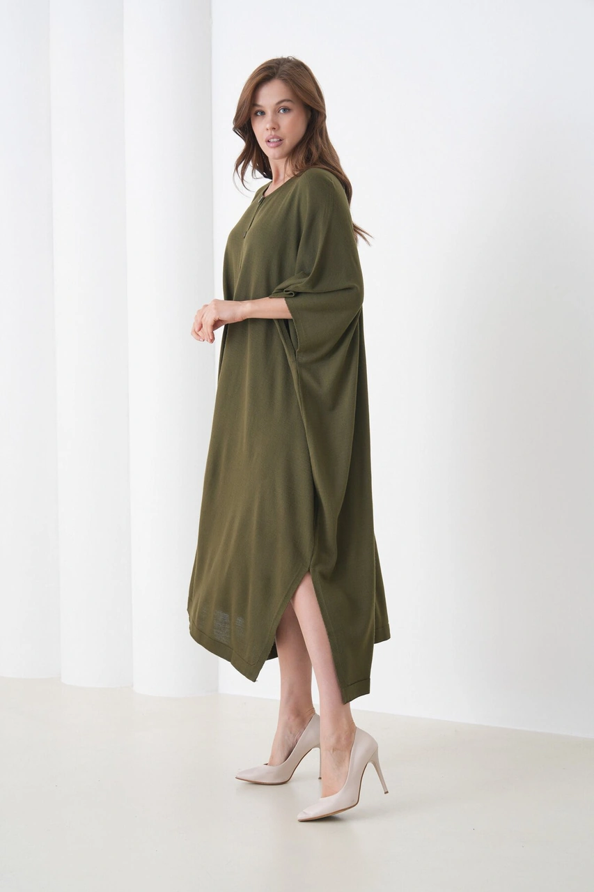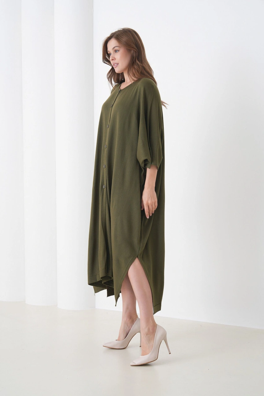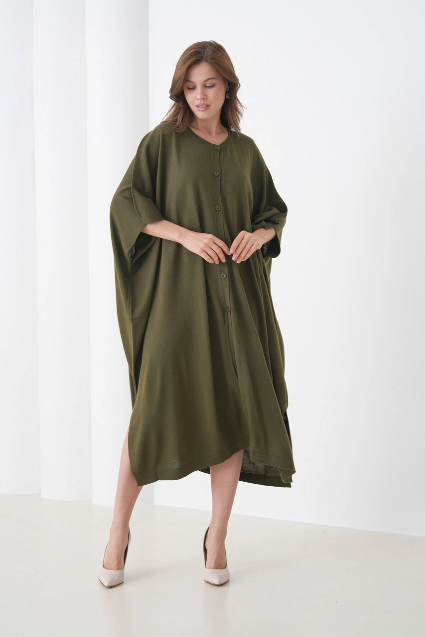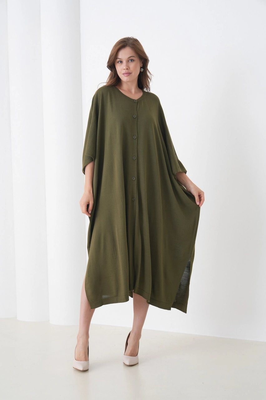 Kadın Tesettüre Uygun Önden Düğmeli Asimetrik Kesim Yarasa Kol Şık Geniş Kalıp Panço Ceket Haki