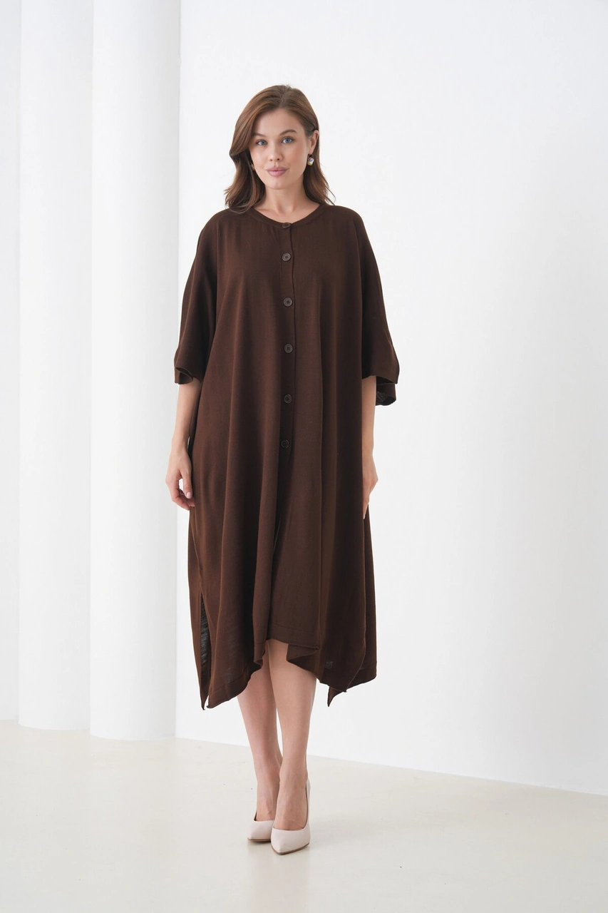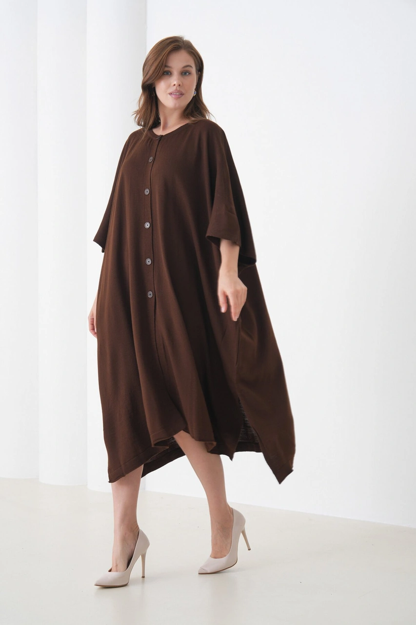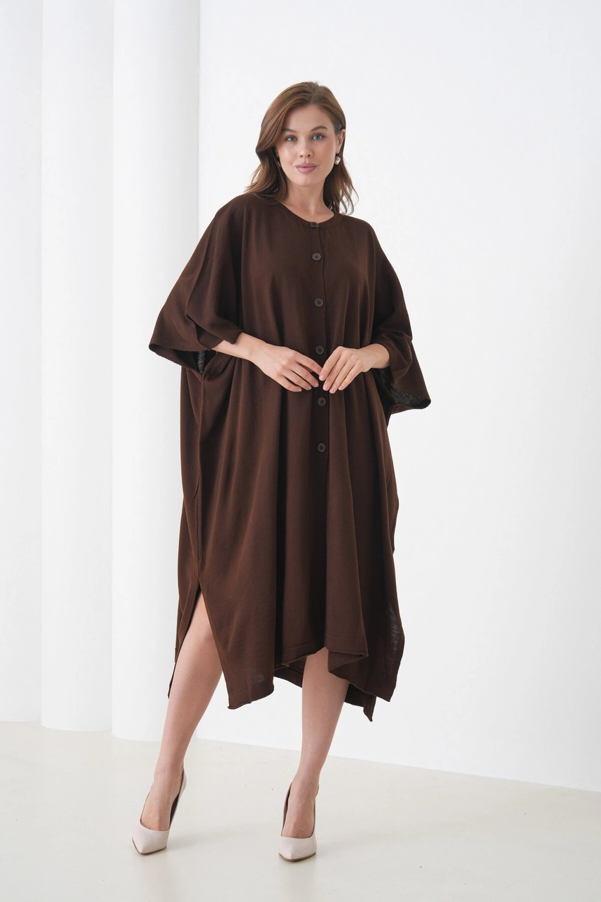 Kadın Tesettüre Uygun Önden Düğmeli Asimetrik Kesim Yarasa Kol Şık Geniş Kalıp Panço Ceket Kahverengi