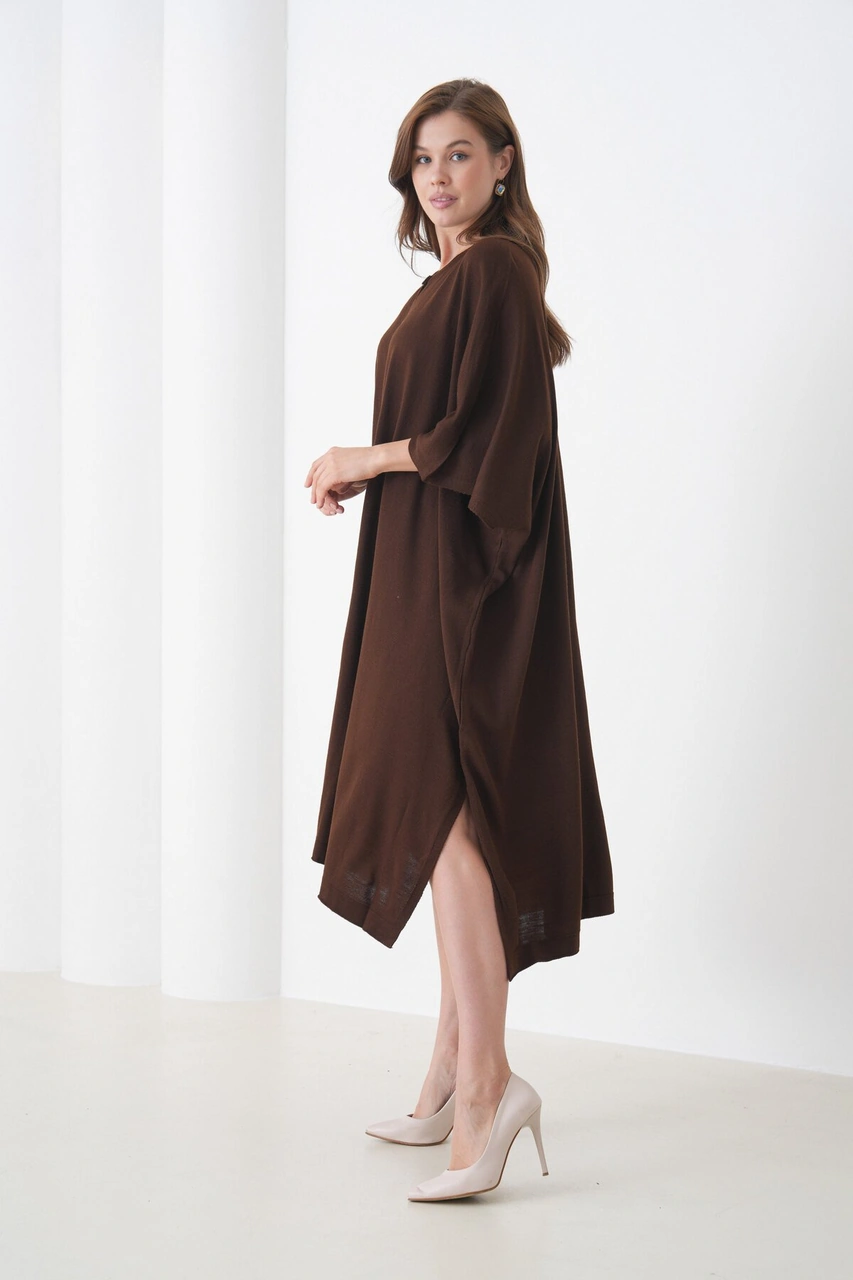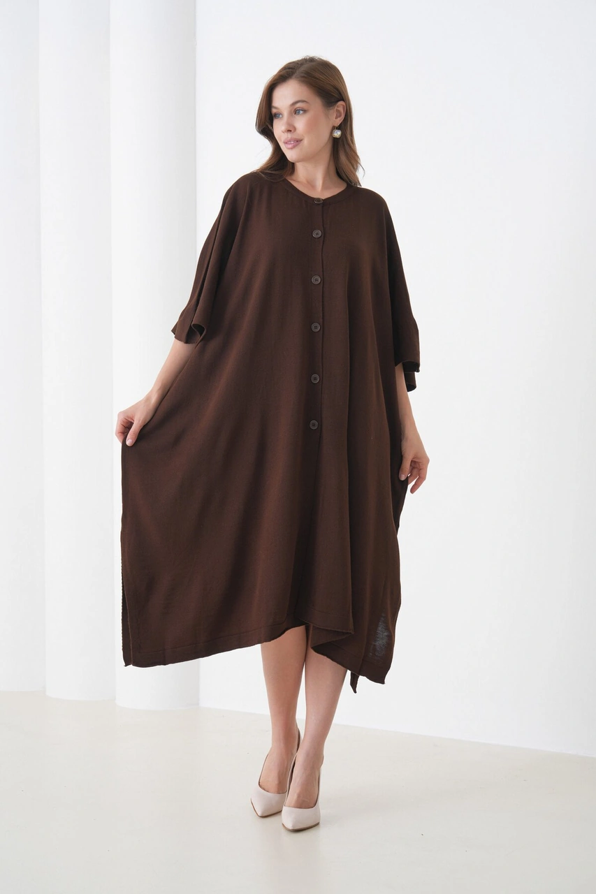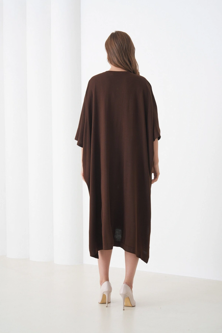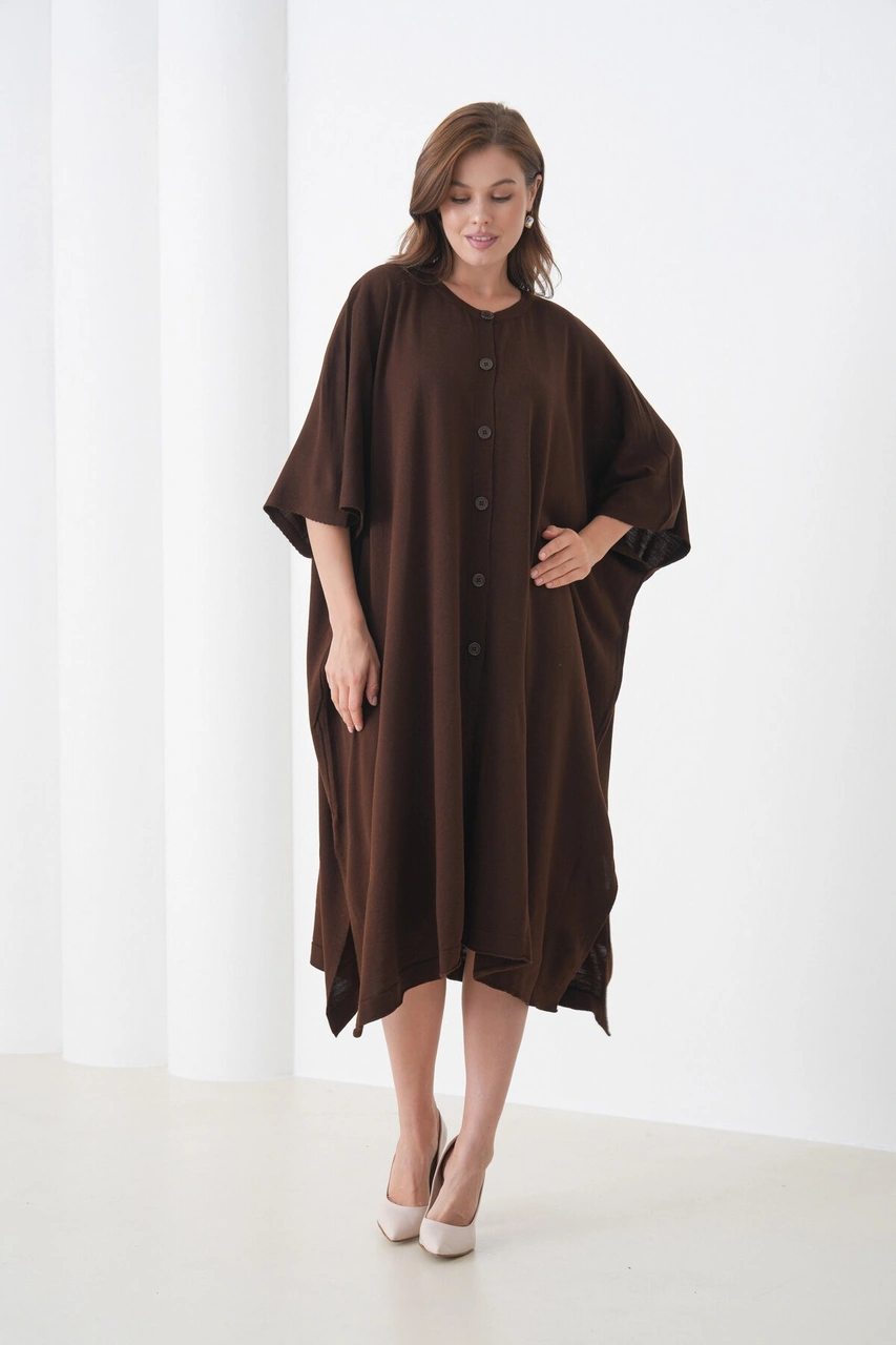 Kadın Tesettüre Uygun Önden Düğmeli Asimetrik Kesim Yarasa Kol Şık Geniş Kalıp Panço Ceket Kahverengi