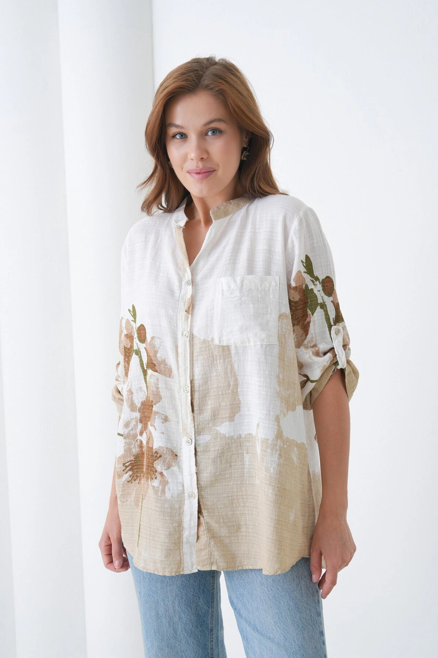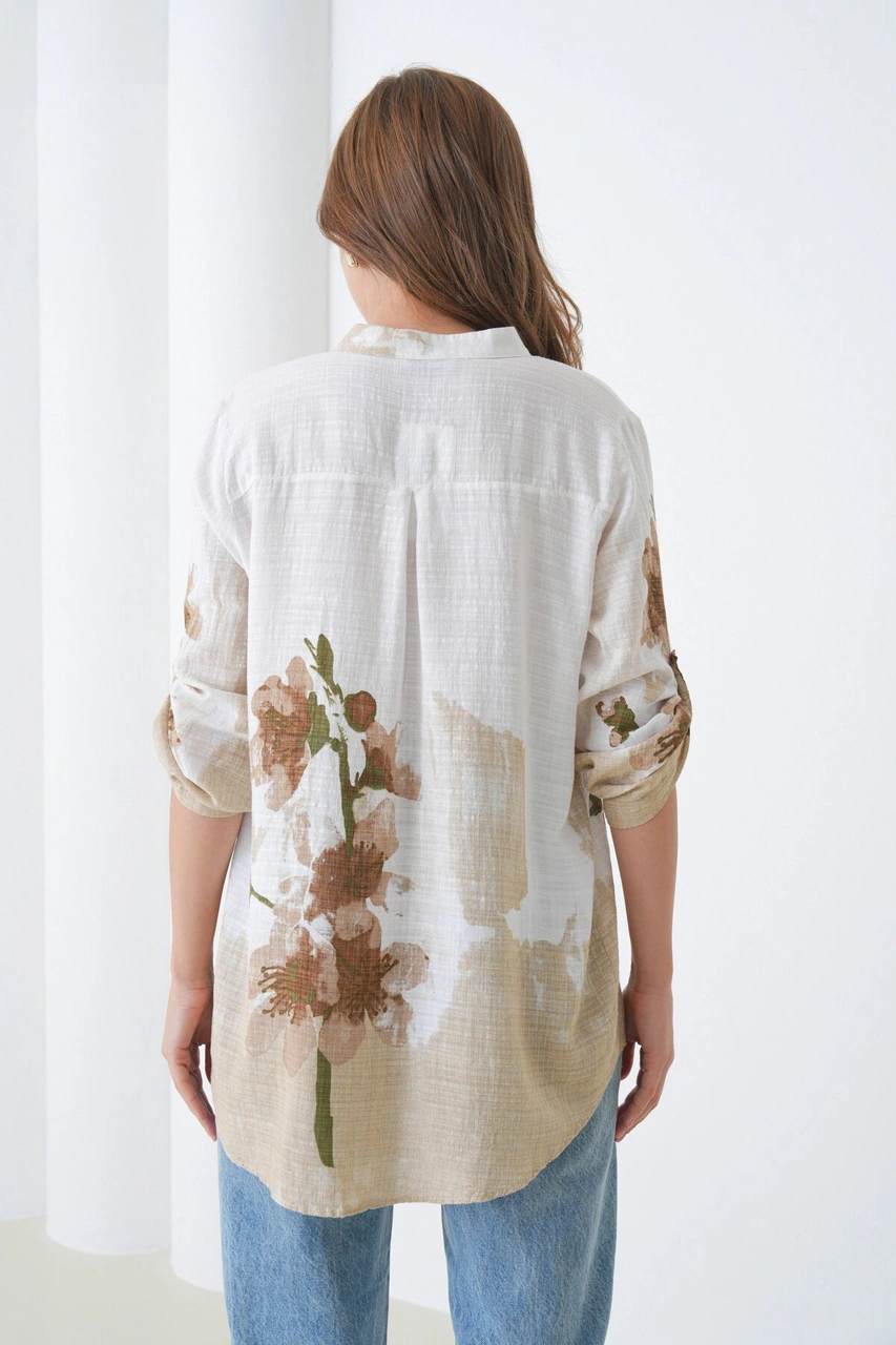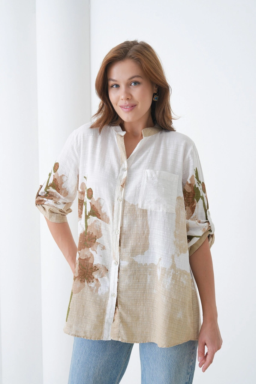 Kadın Tesettüre Uygun Uzun Kol Pamuk Şık Büyük Beden Desenli Curve Rahat İtalyan Keten Gömlek Kahverengi