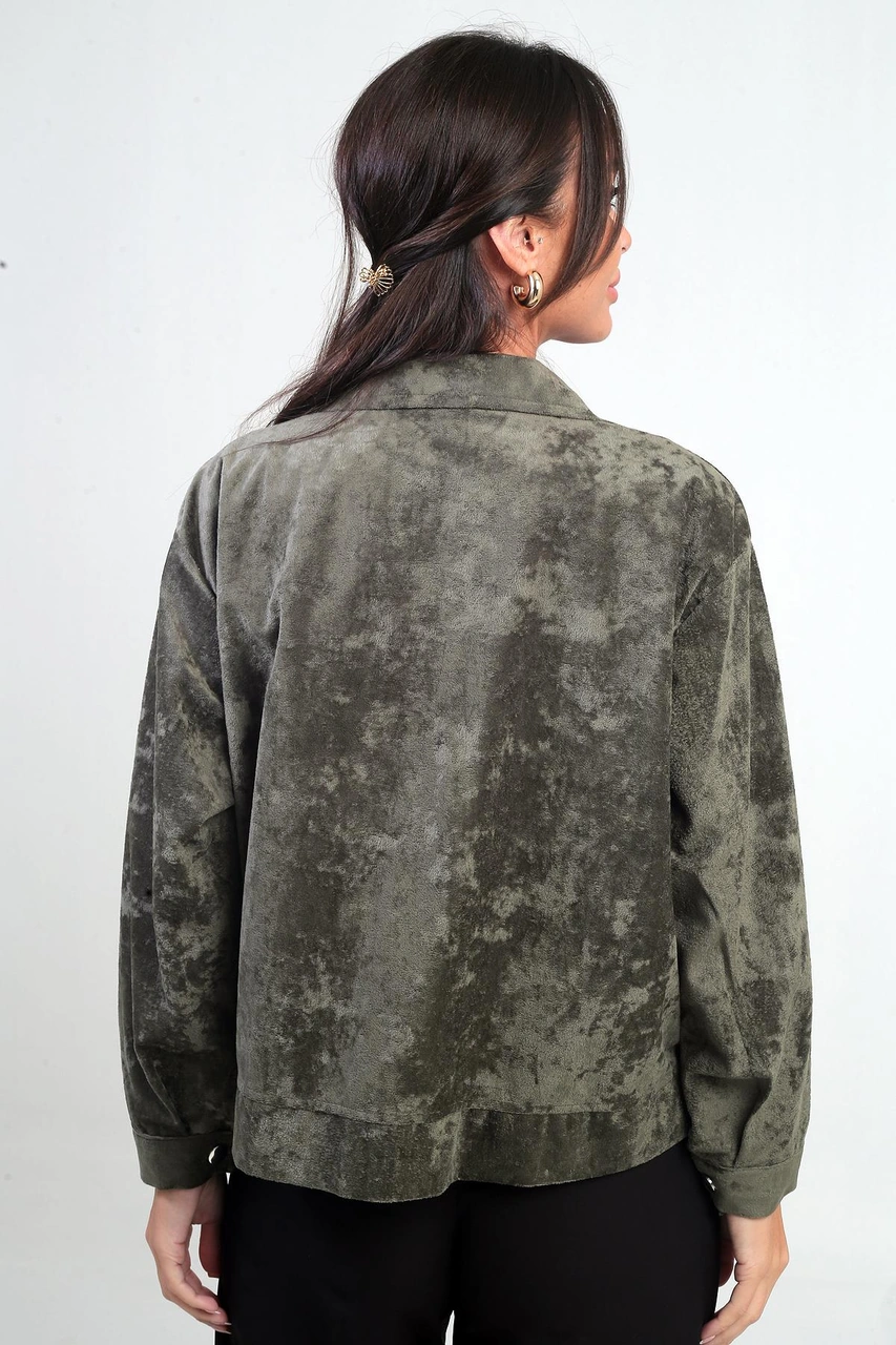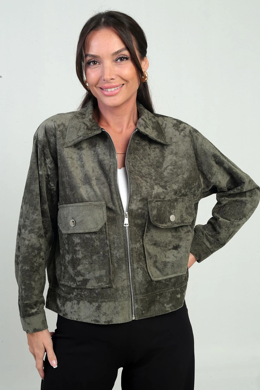 Kadın Torba Cepli Önü Fermuarlı Süet Mont-41927 Haki