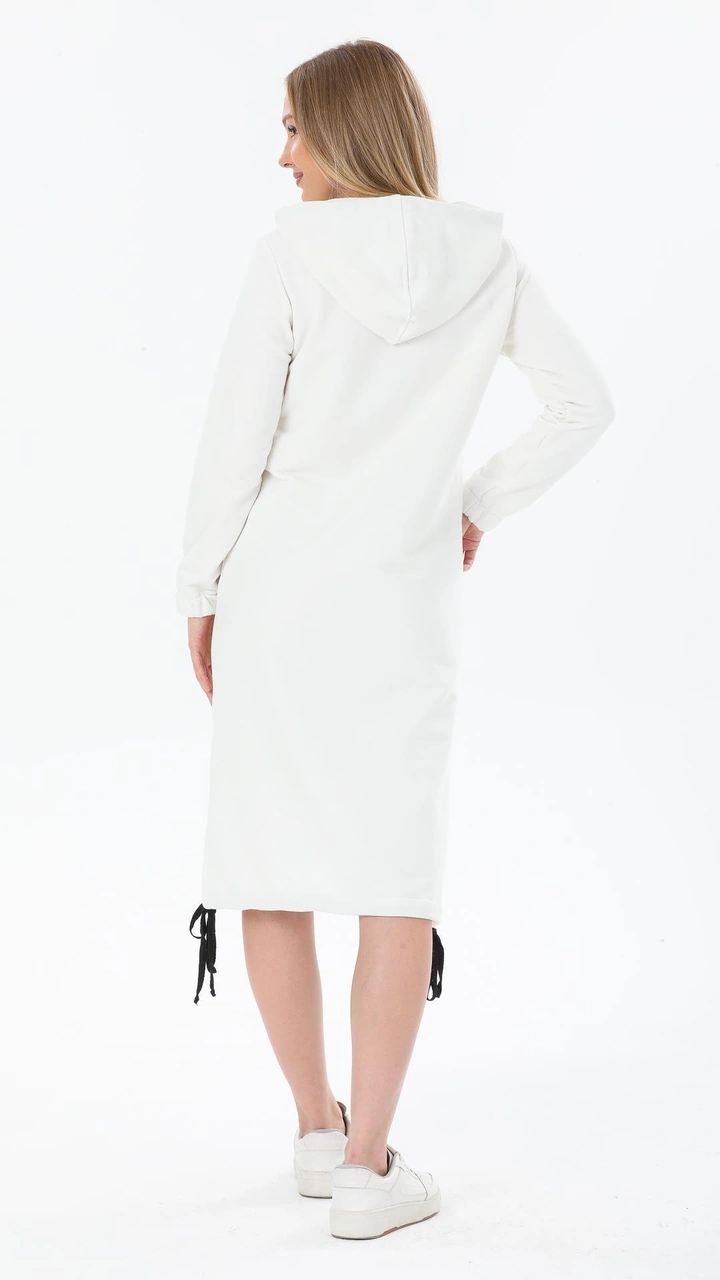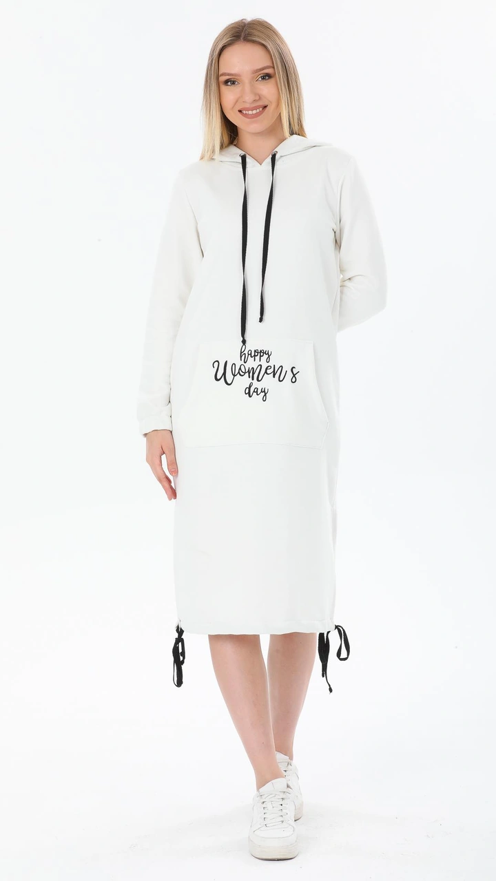 Kadın Uzun Boy Happy Women's Day Yazılı Beyaz Kapüşonlu Cepli Elbise Beyaz