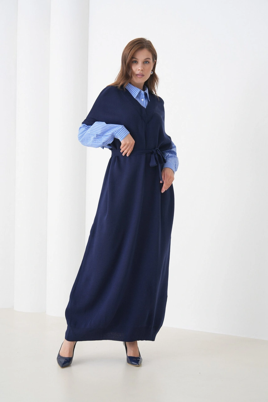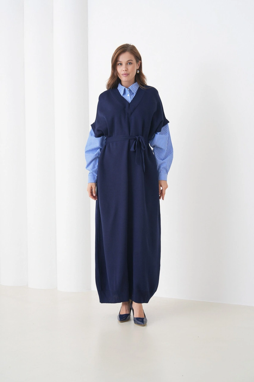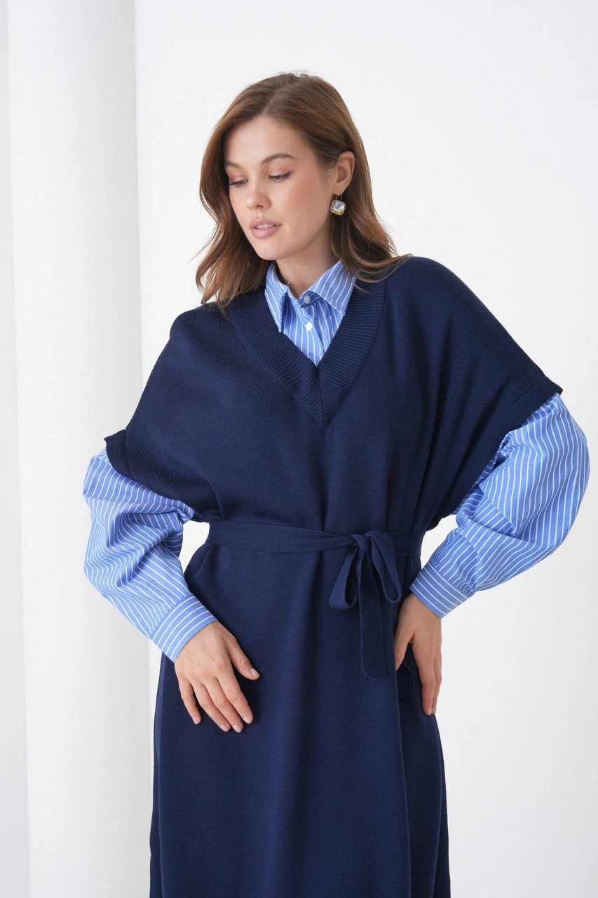 Kadın Uzun Kol Gömlek Yaka İçi Gömlekli Triko Kuşaklı Triko Spor Şık Elbise Lacivert