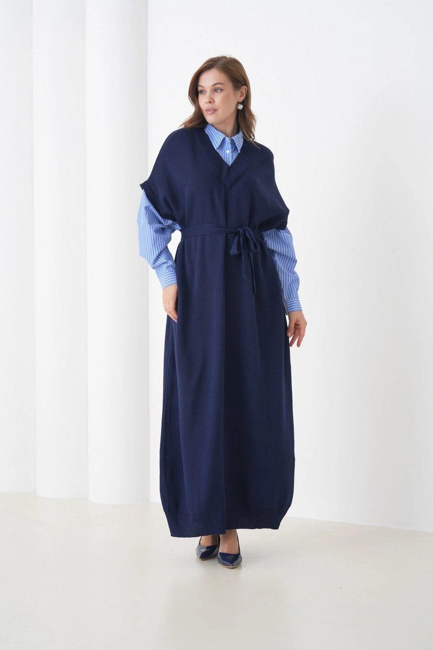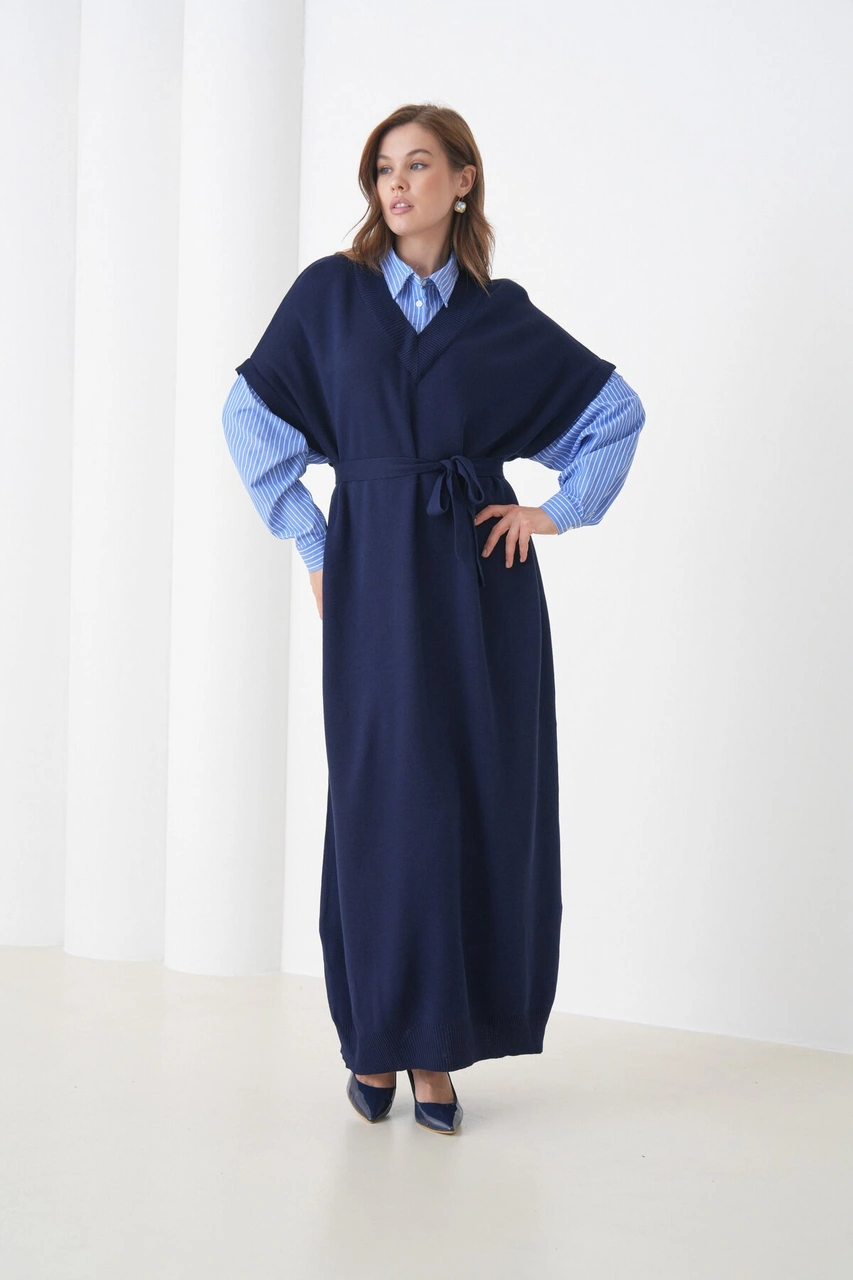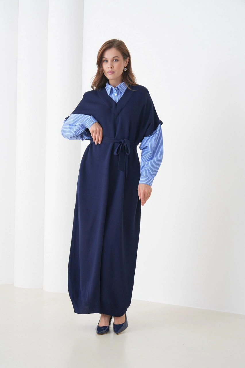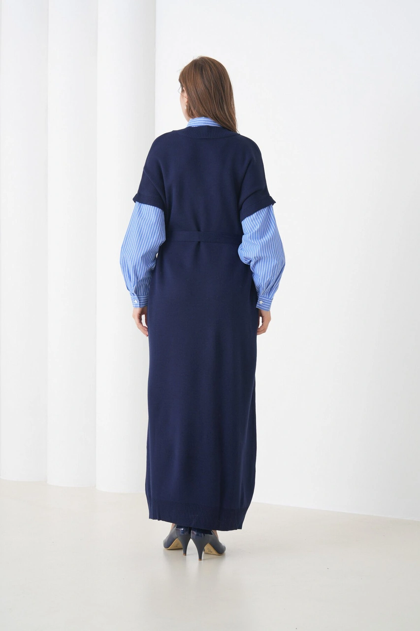 Kadın Uzun Kol Gömlek Yaka İçi Gömlekli Triko Kuşaklı Triko Spor Şık Elbise Lacivert