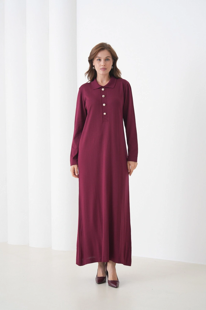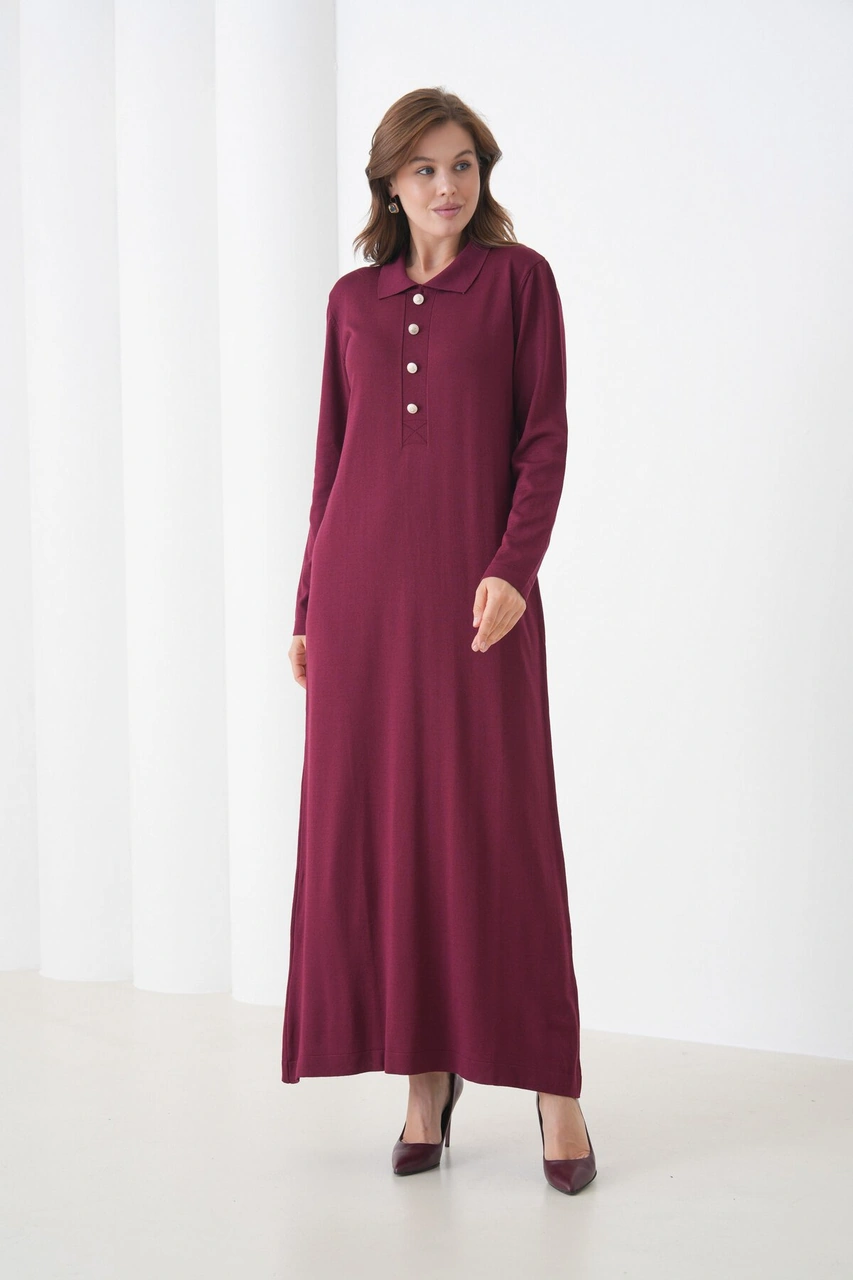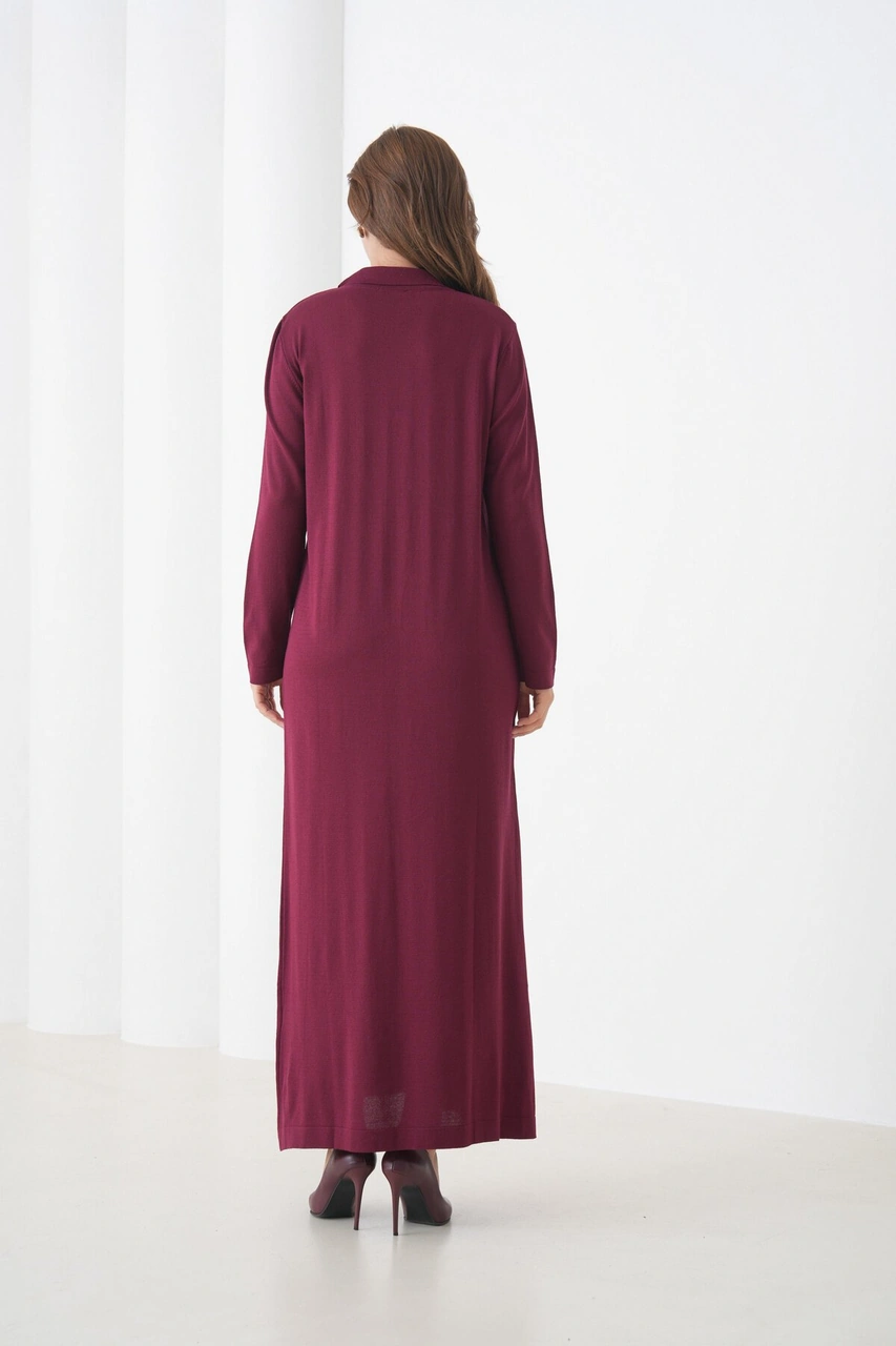Kadın Uzun Kol Gömlek Yaka Triko Önden Düğmeli Triko Spor Şık Elbise Bordo