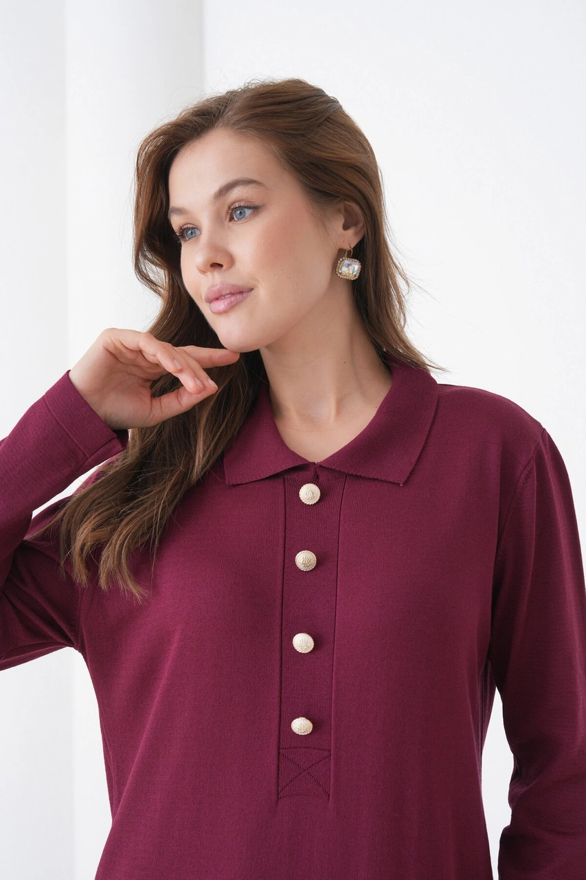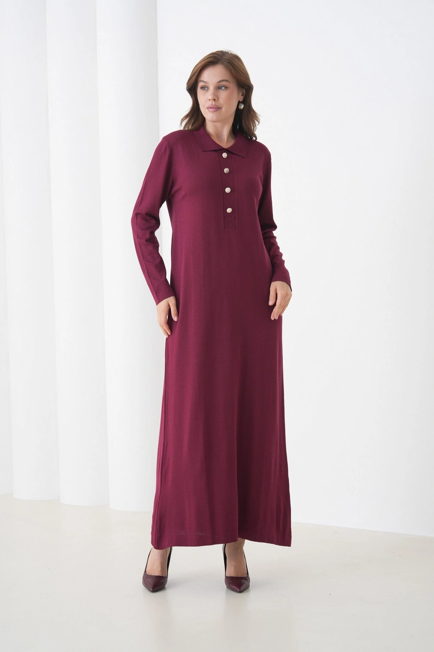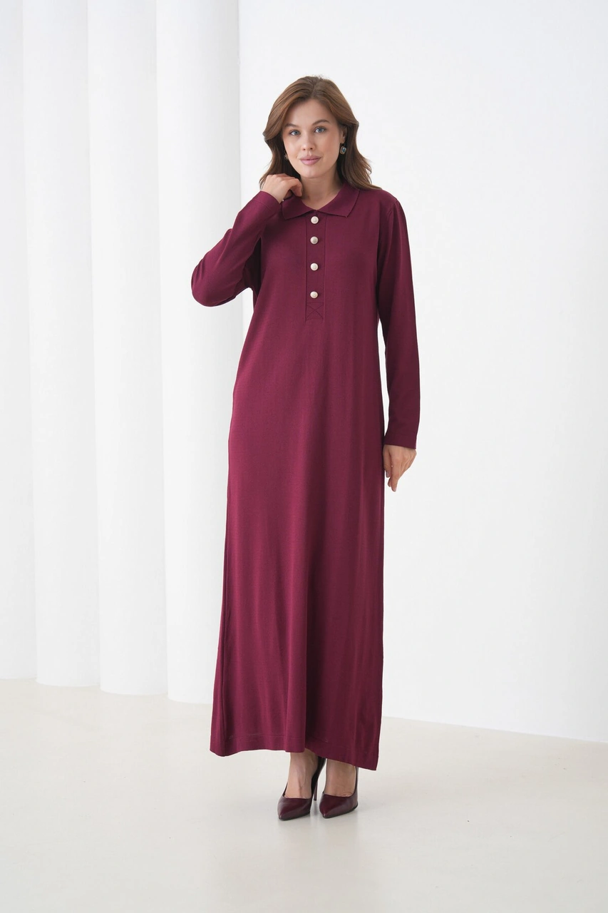 Kadın Uzun Kol Gömlek Yaka Triko Önden Düğmeli Triko Spor Şık Elbise Bordo