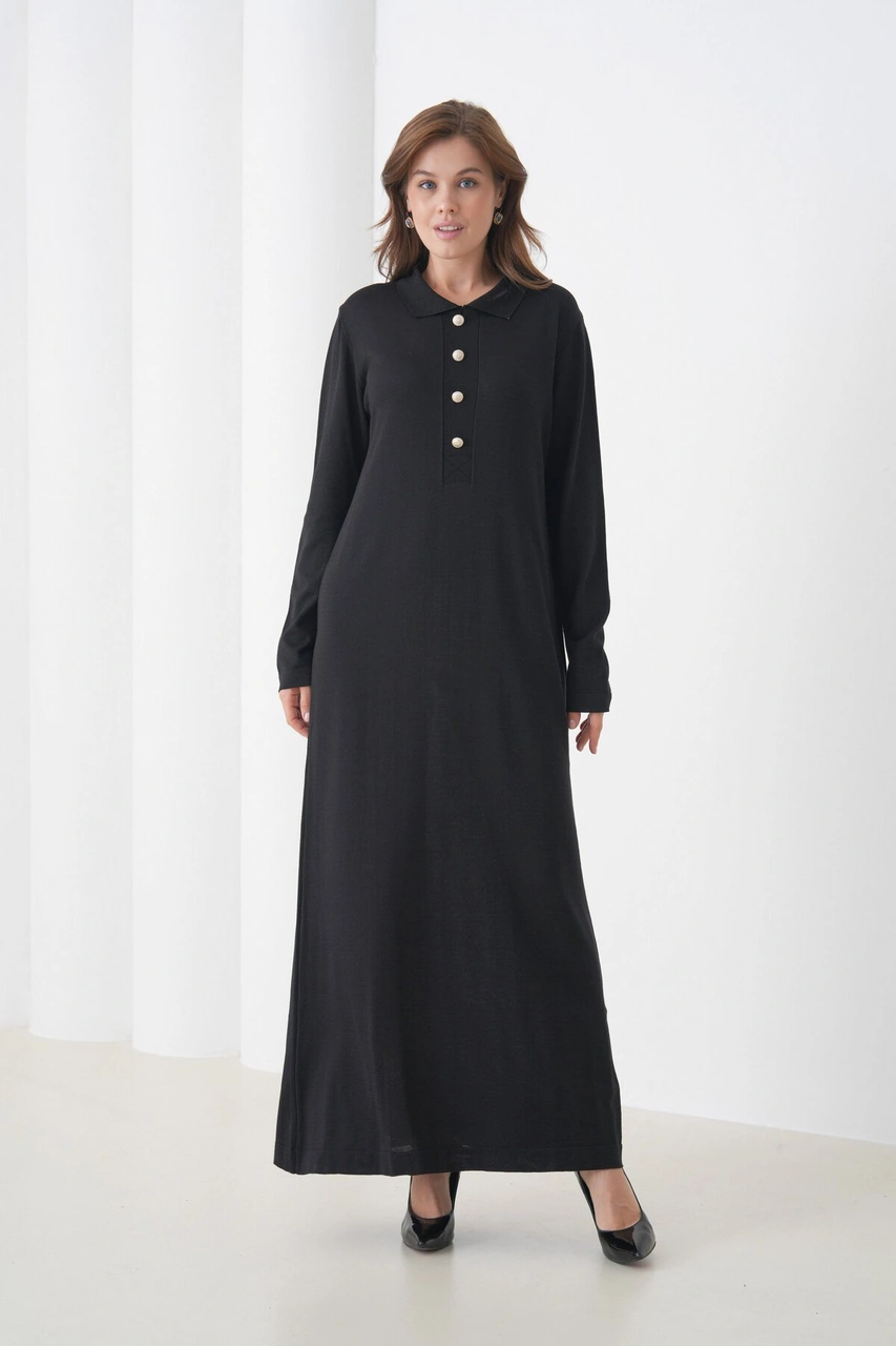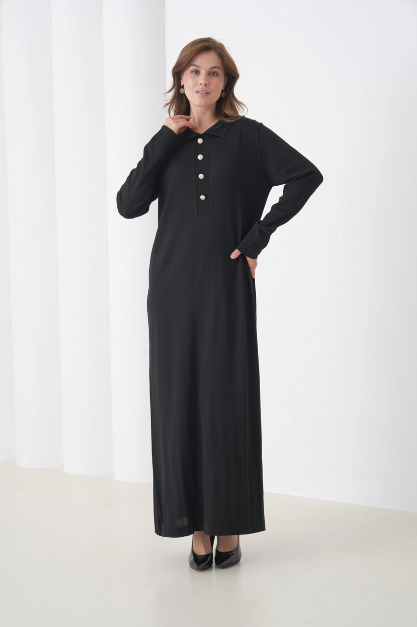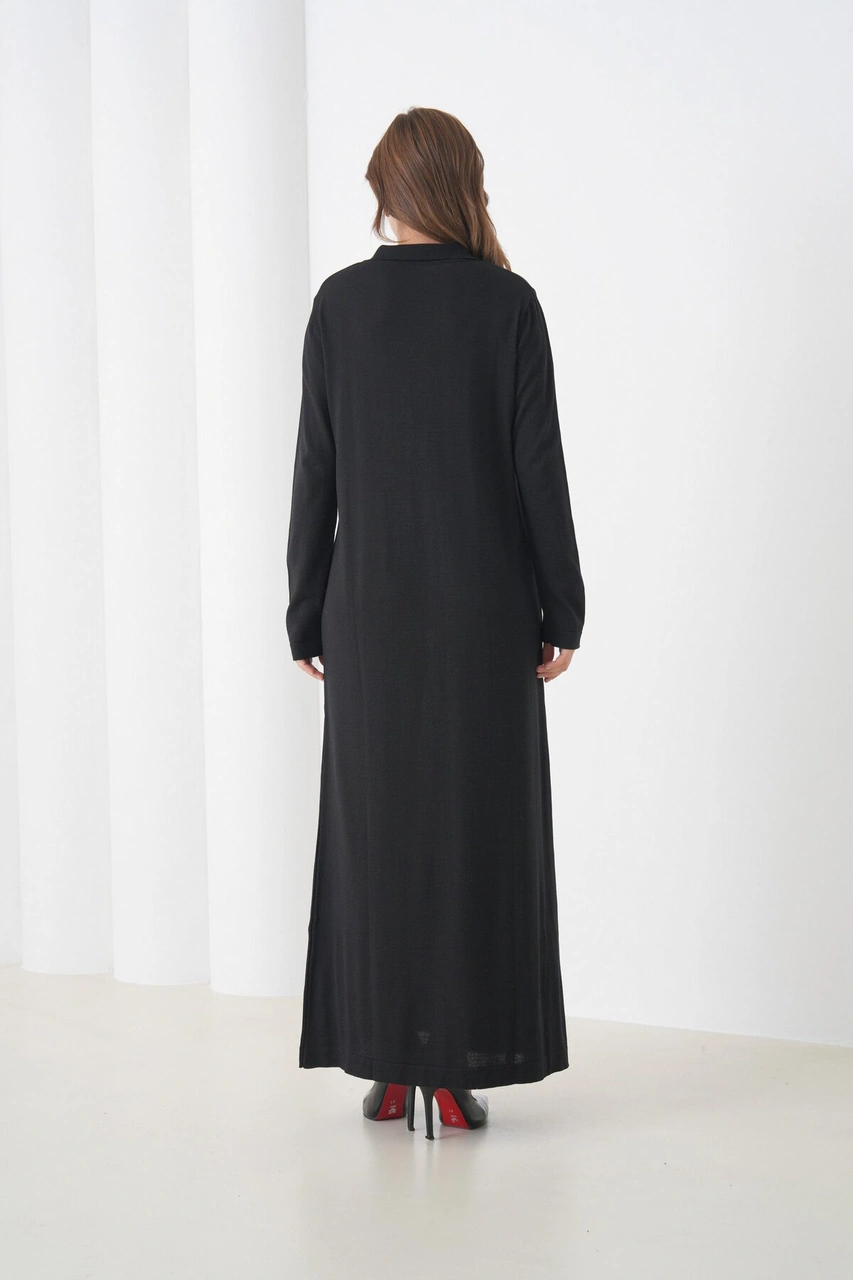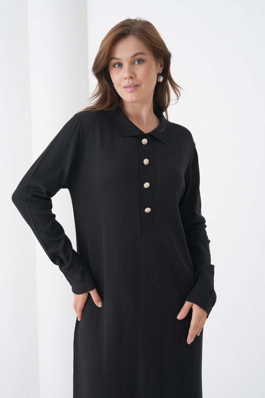 Kadın Uzun Kol Gömlek Yaka Triko Önden Düğmeli Triko Spor Şık Elbise Siyah