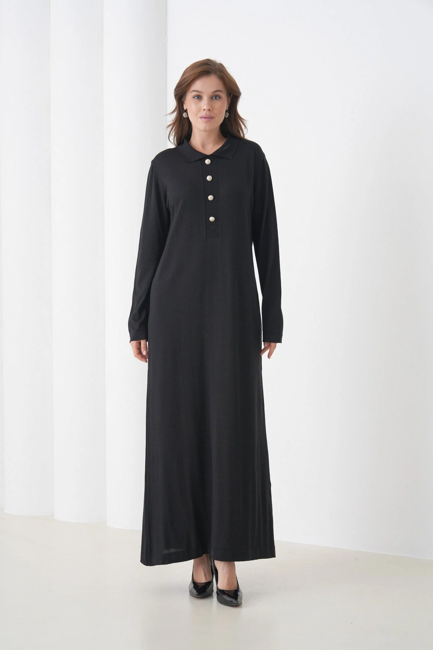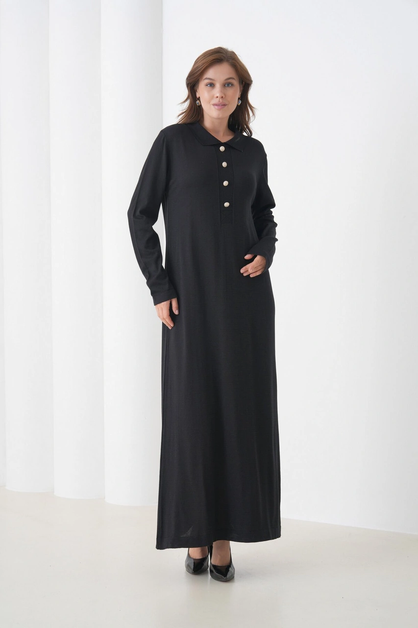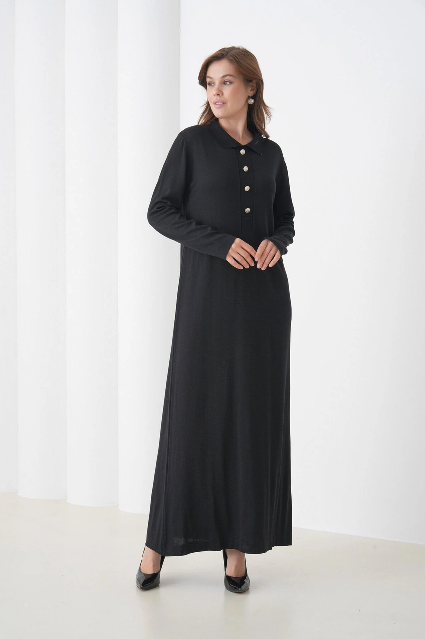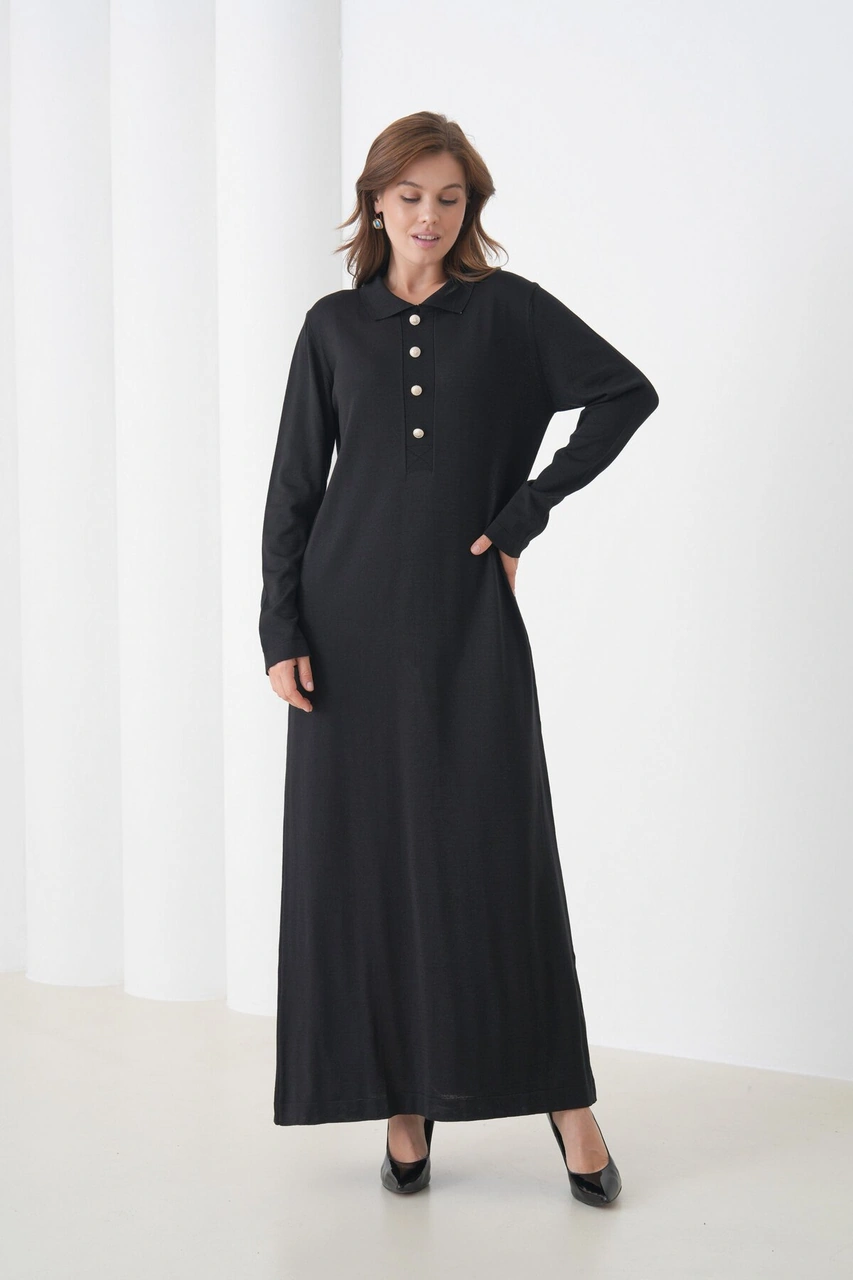 Kadın Uzun Kol Gömlek Yaka Triko Önden Düğmeli Triko Spor Şık Elbise Siyah