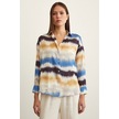 Kadın Uzun Kol Sulu Boya Desenli Renkli Pamuk Saten Premium Kalite Spor Şık Gömlek Mavi