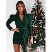 Kadın Uzun Kollu Kruvaze Yaka Karpuz Kol Eteği Fırfır Detay Krep Mini Elbise Zümrüt