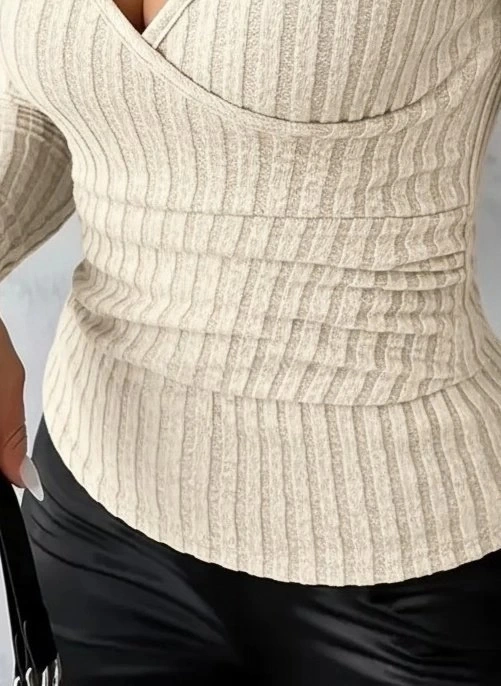 Kadın Uzun Kollu Kruvaze Yakalı Incili Şardonlu Kaşkorse Bluz Bej