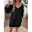 Kadın Uzun Kollu V Yakalı Şerit Detaylı Kısa Viskon Iki Iplik Elbise Siyah