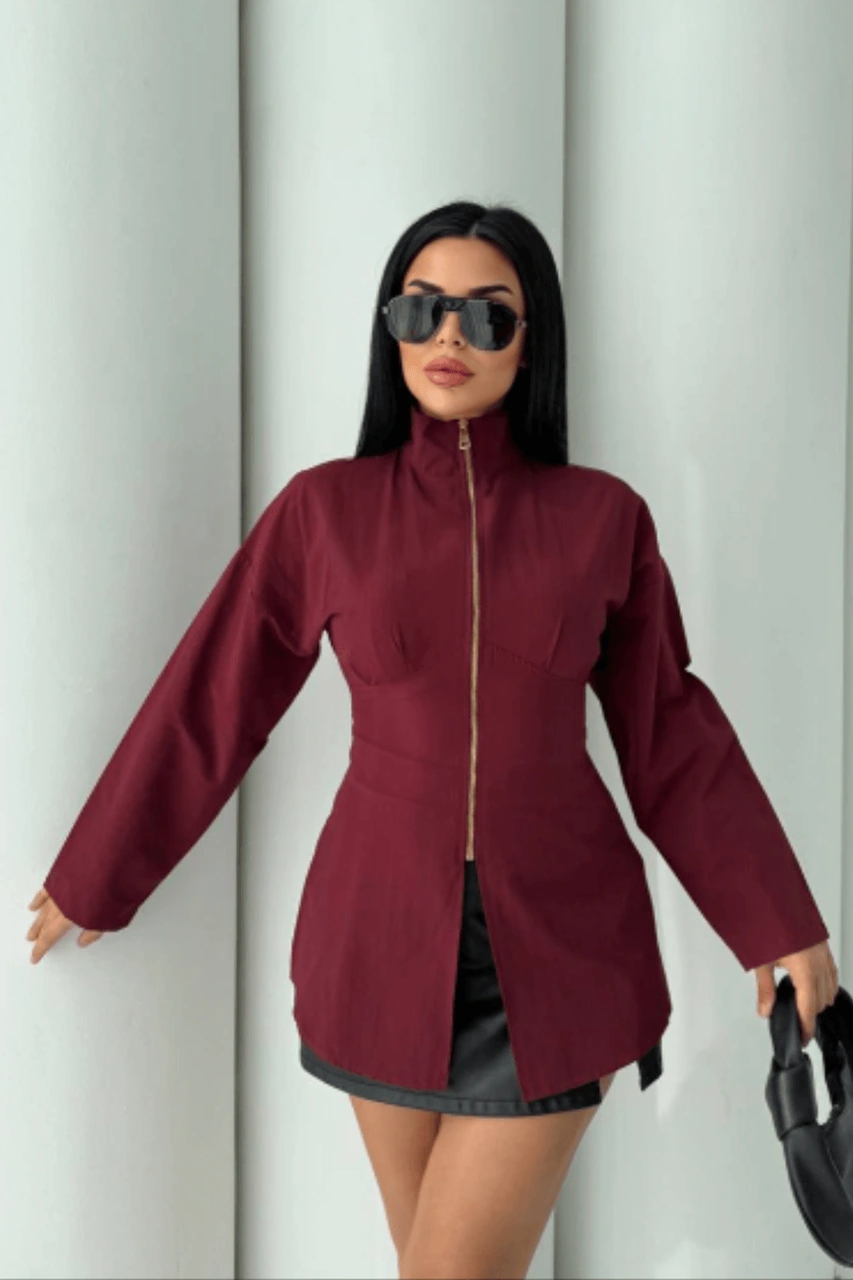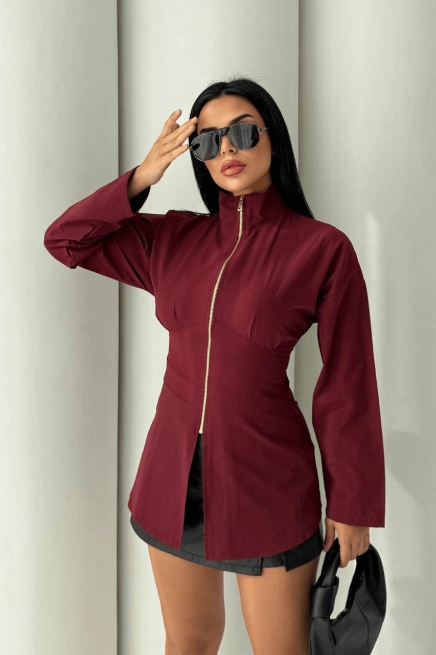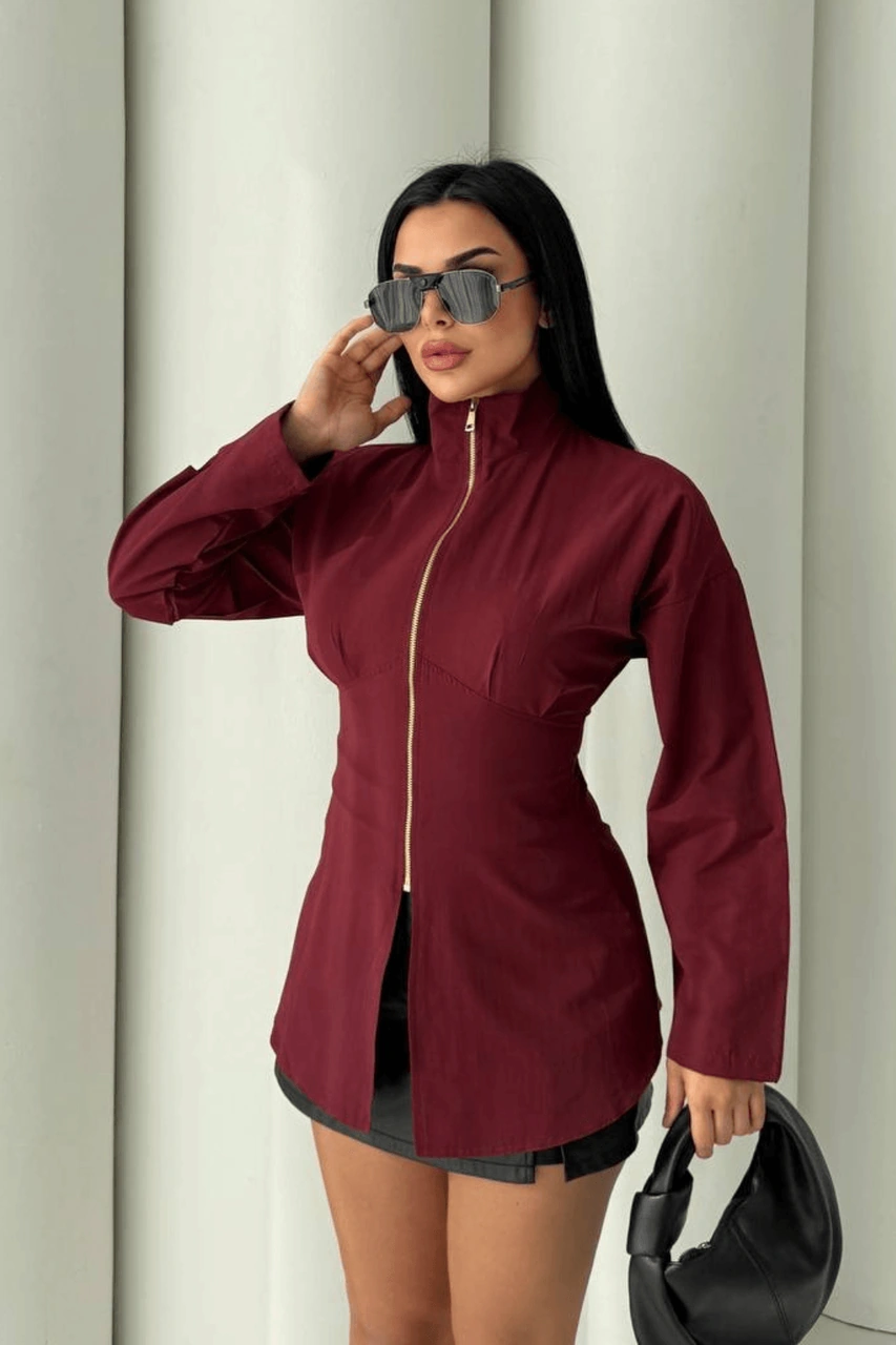 Kadın V Yaka Fermuarlı Gömlek Bordo