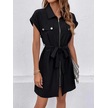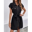 Kadın Yakalı Fermuarlı Kuşaklı Cepli Kısa Kollu Krep Kısa Elbise