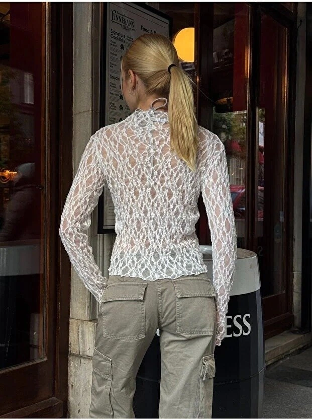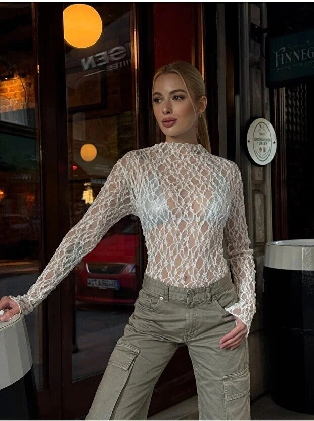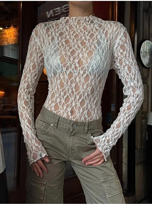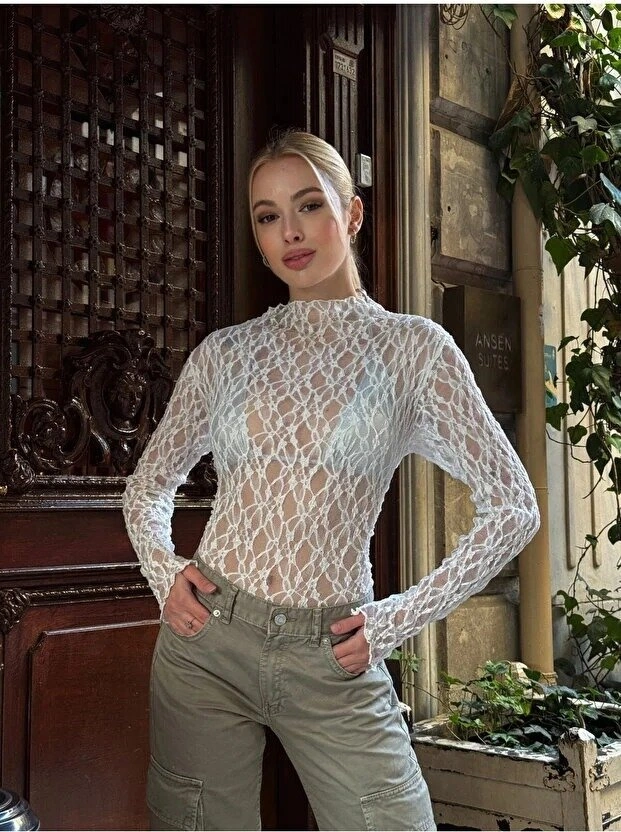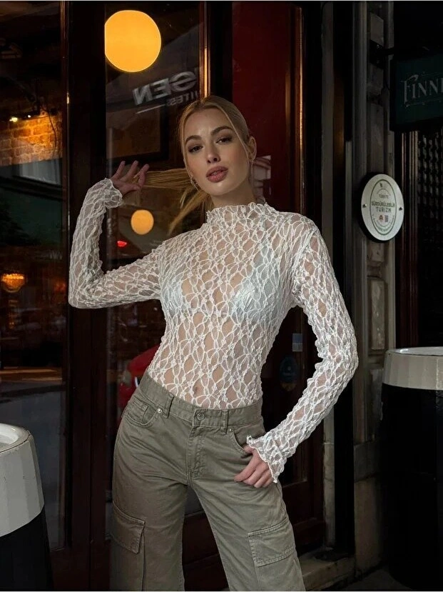 Kadın Yarım Balıkçı Yaka Full Esnek Dantel Bürümcük Spor Şık Tasarım Gece Bluzu Beyaz