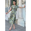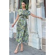 Kadın Yeşil Desenli, Yarım Kol Ve Yarım Patlı Gömlek Yaka, Beli Lastikli, Salaş Uzun Saten Elbise Yeşil