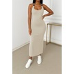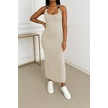 Kadın Yuvarlak Yaka Sırttan Çapraz Şerit Love Detaylı Yırtmaçlı Viskon Elbise Bej