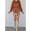 Kahverengi Yakası Fırfırlı Kuşaklı Saten Gömlek Kahve