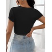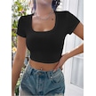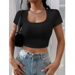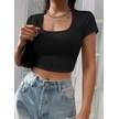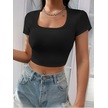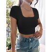 Kare Yaka Siyah Renk Fitilli Kısa Kollu Slim Fit Crop Top Bluz