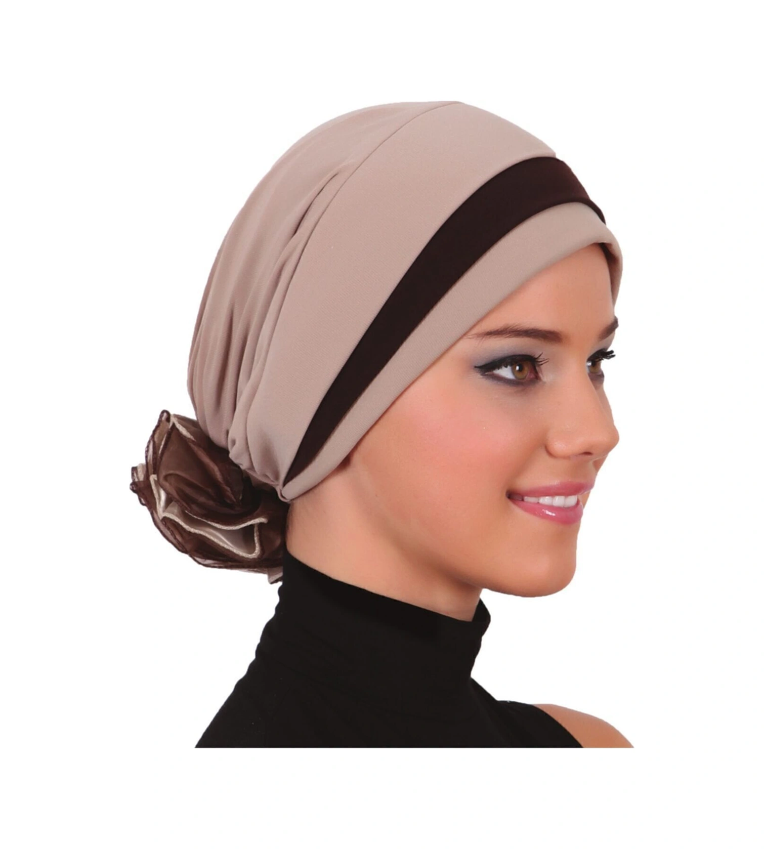 Katlı Arkası Organze Güllü Bej Kahve Hazır Türban Tesettür Bone Bej-kahve