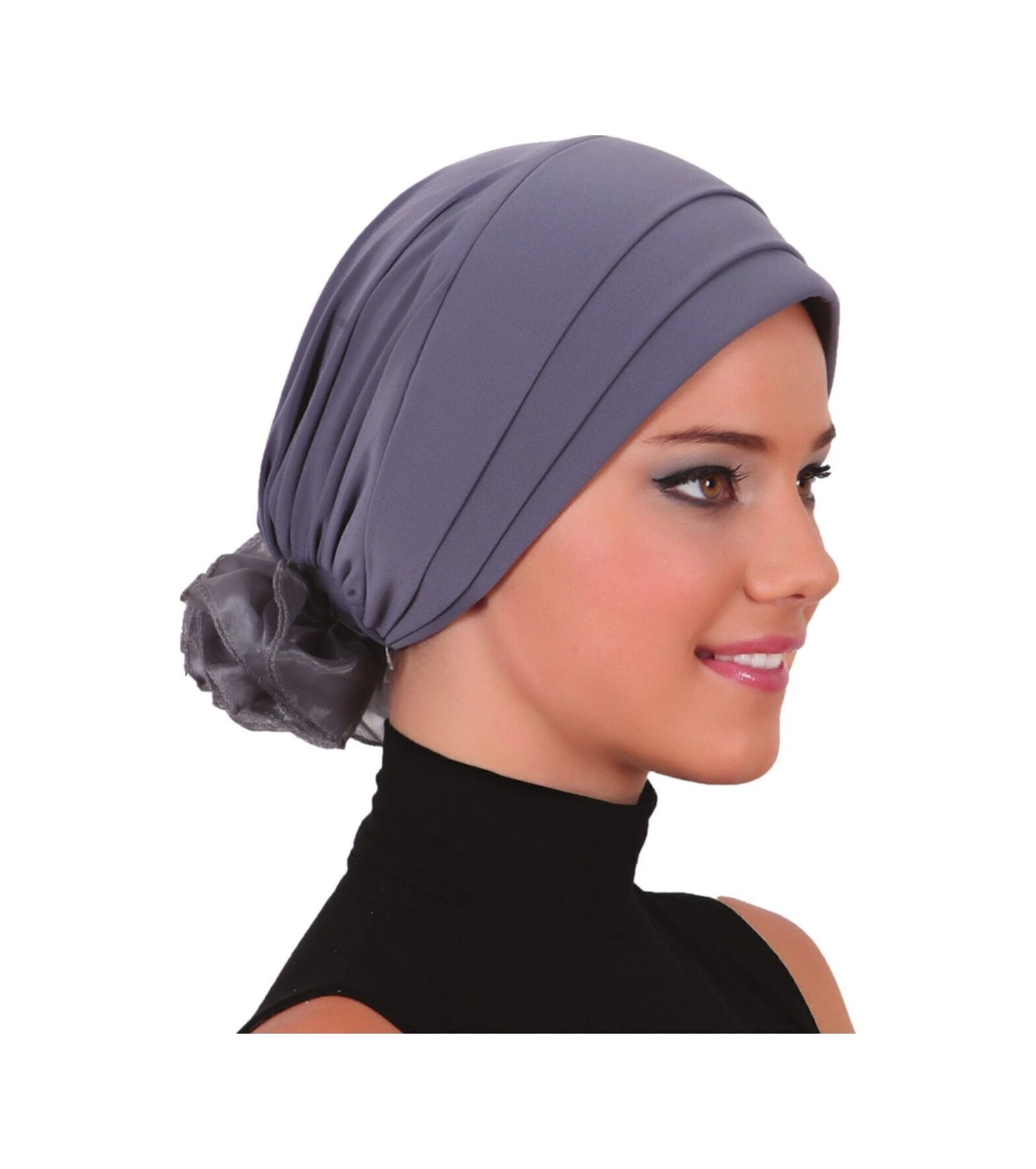 Katlı Arkası Organze Güllü Koyu Gri Hazır Türban Tesettür Bone Koyu Gri