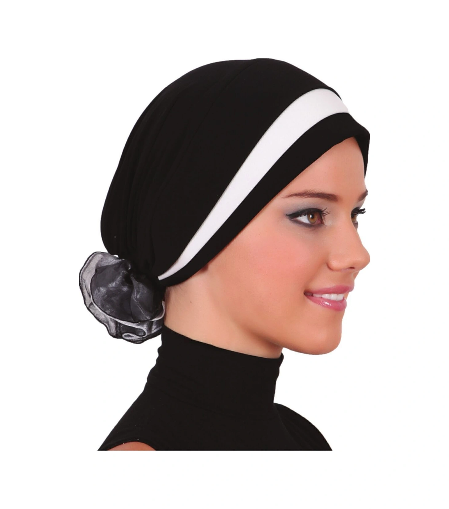 Katlı Arkası Organze Güllü Siyah-krem Hazır Türban Tesettür Bone Siyah-krem