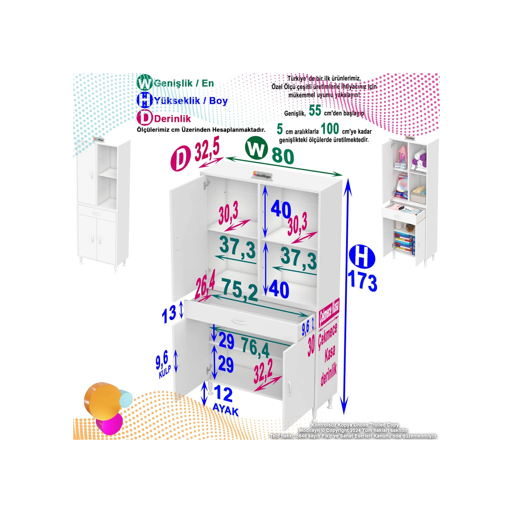 Kayra Banyo Ve Mutfak Dolabı Çok Amaçlı Dolap Tek Çekmece 3 Kapak 3 Raf 6 Bölme 80x173x32,5 Cm Beyaz