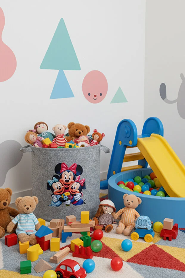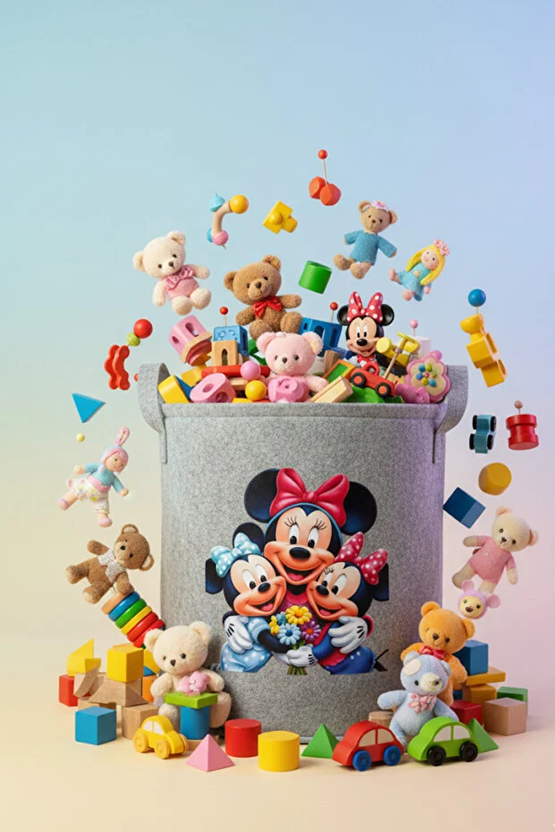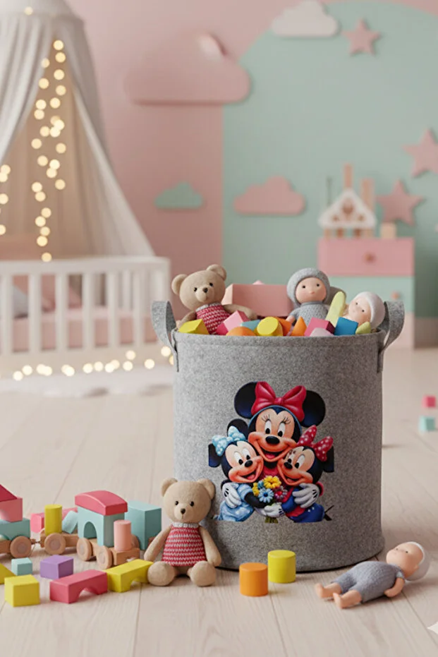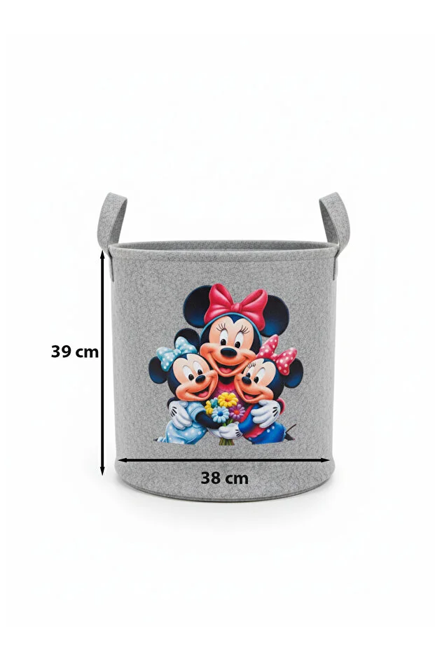 Keçe Oyuncak Sepeti Çizgi Film Desenli, Katlanabilir Kulplu, Çocuk Odası Düzenleyici 38x39 Açık Gri