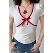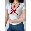 Kırmızı Şeritli Fiyonk Detaylı Beyaz Y2k Kısa Kollu Crop-17918 Beyaz