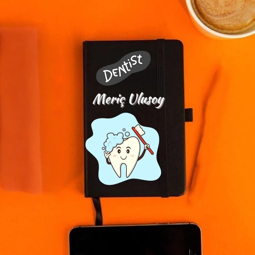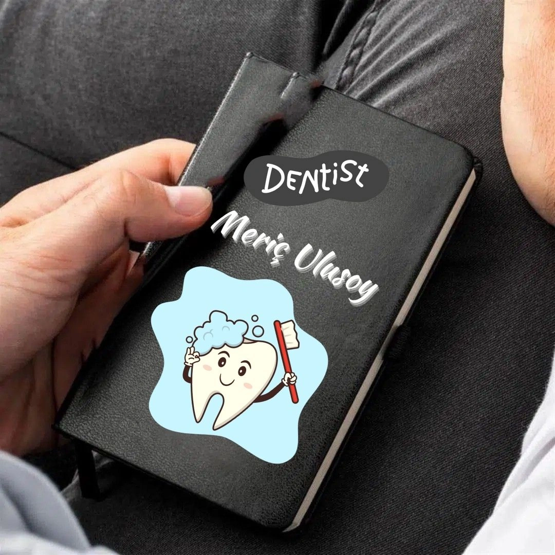 Kişiye Özel Diş Doktoru Tasarımlı Deri Not Defteri Tüy Kalem Detaylı Şık Hediye Siyah