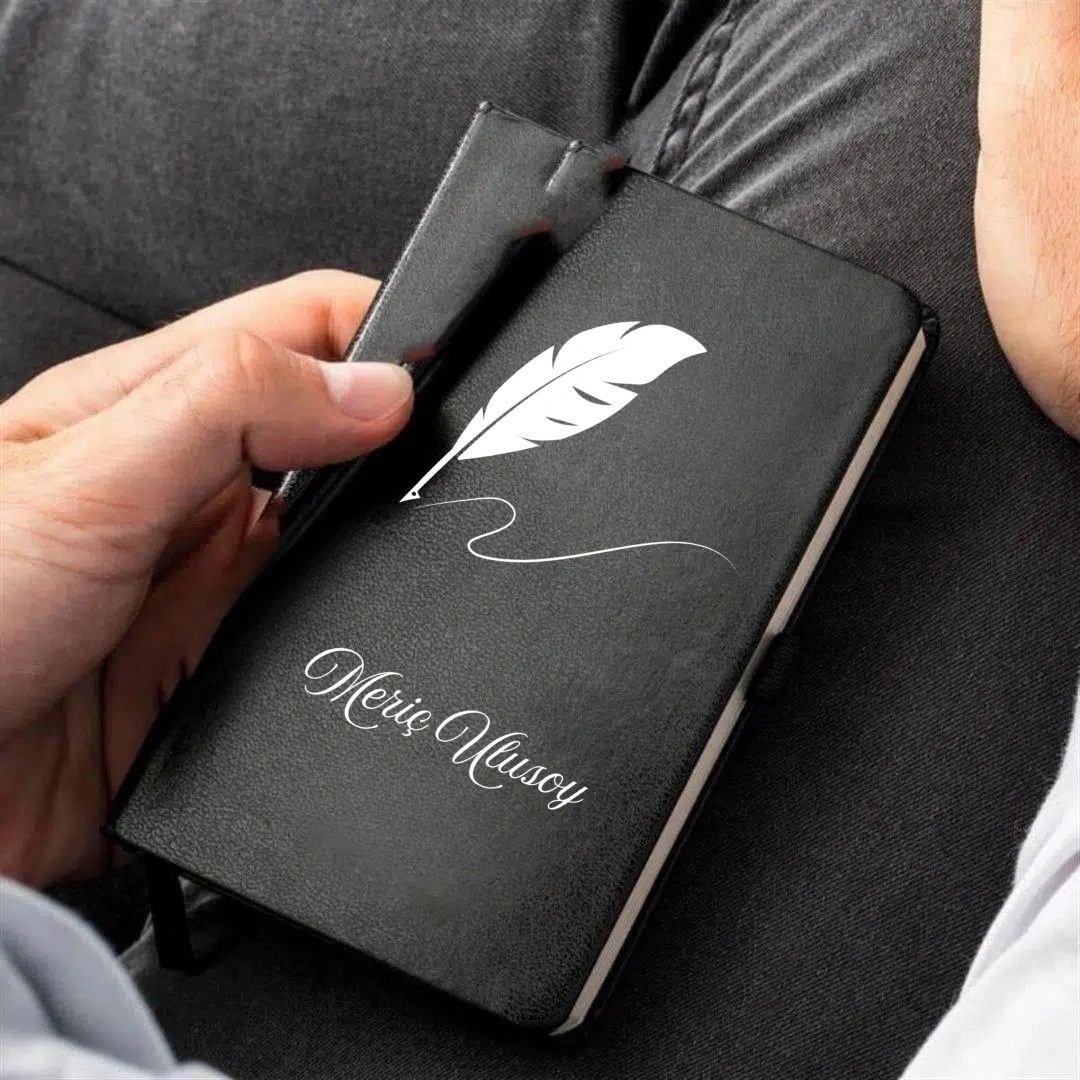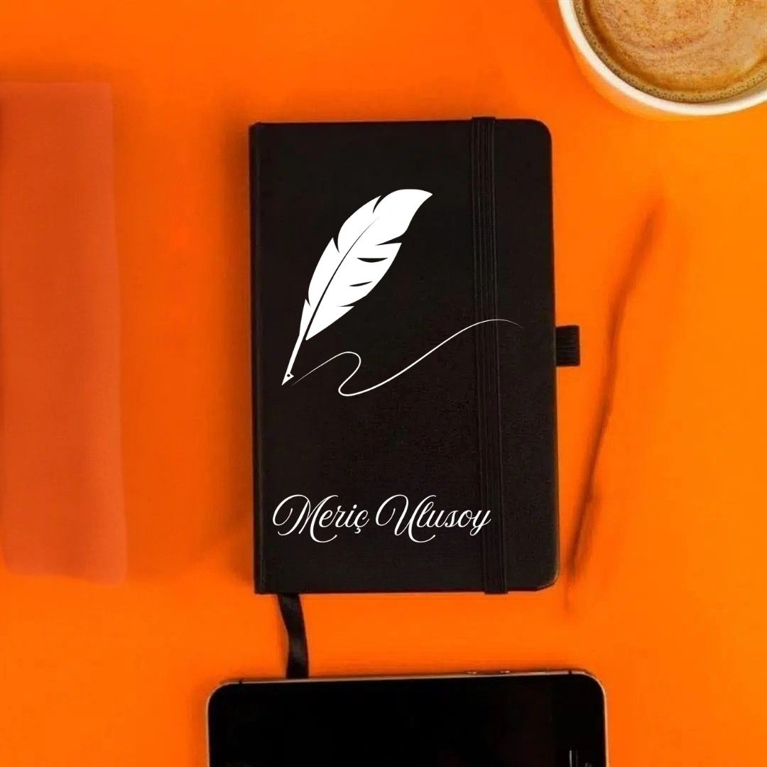 Kişiye Özel Yazar Temalı Tüy Kalem Tasarımlı Deri Not Defteri İlham Veren Hediye Siyah