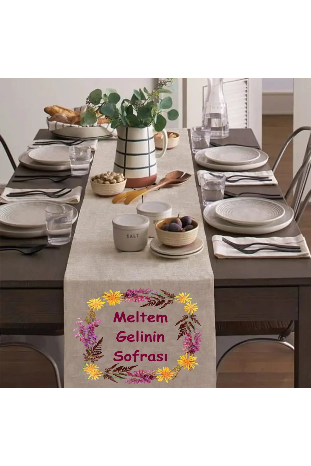 Kişiye Özel Yazılı Çelenk Tasarımlı Runner, Runer, Masa Örtüsü, Sofranıza Zarafet Katın Runner Çok Renkli
