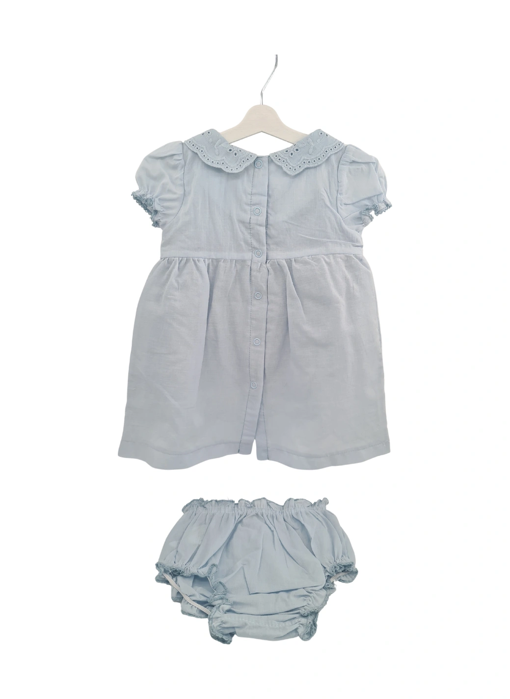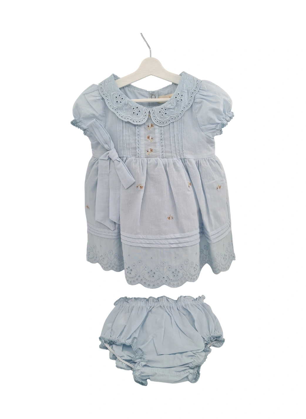 Kız Bebek Mavi Çiçek İşlemeli Fistolu Elbise Kilotlu Takım-1348 Mavi