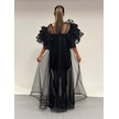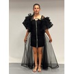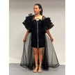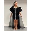 Kız Çocuk Abiye Siyah Krep Kumaş Askılı Taş Şerit İşlemeli Kolları Farbalı Çıkabilen Pelerin Detaylı İllüzyon Yaka Abiye Elbise 10-15 Yaş Siyah