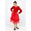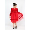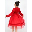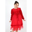 Kız Çocuk Kadife Kumaş Tül Detaylı Diz Boyu Tokalı Elbise Kırmızı