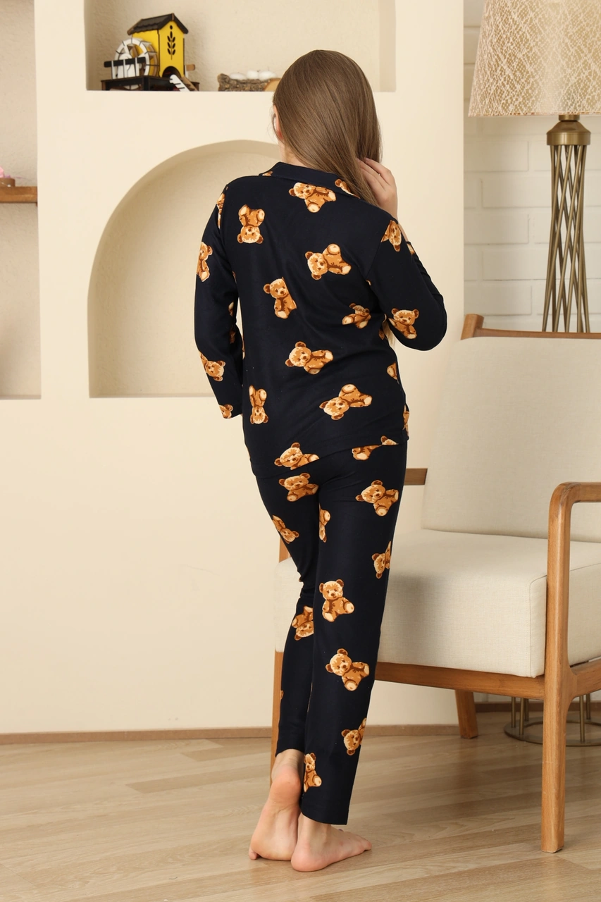 Kız Çocuk Pat Yakalı-ayıcık Baskılı Ve Düğme Kapamalı Pijama Takımı 12308 Lacıvert