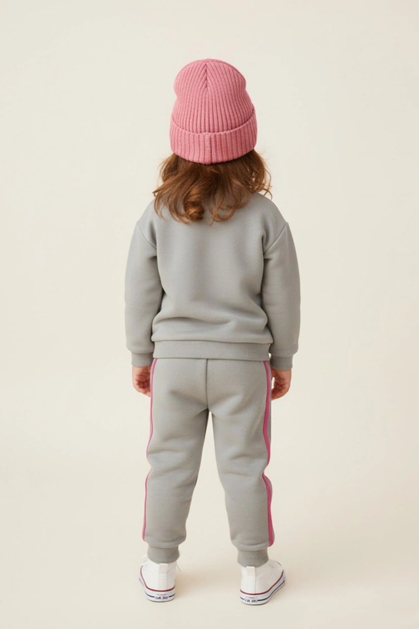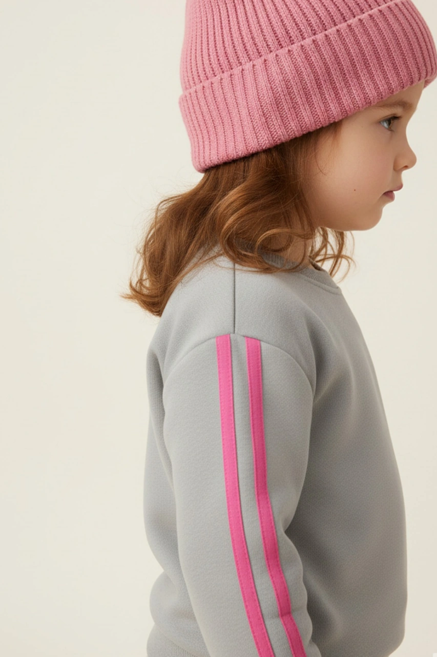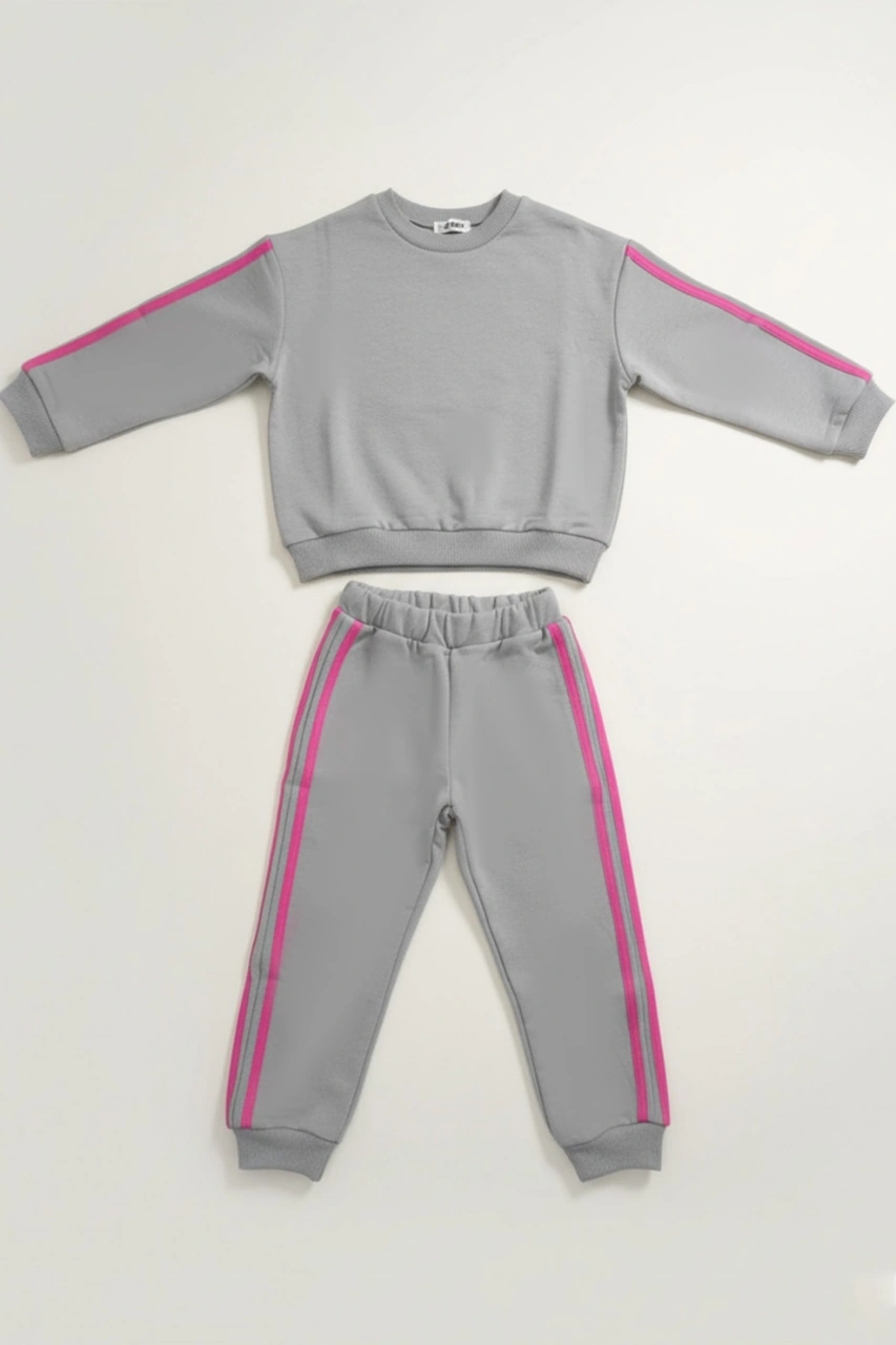 Kız Çocuk Şeritli 3 İplik Gri Alt Üst Takım Gri - Pembe
