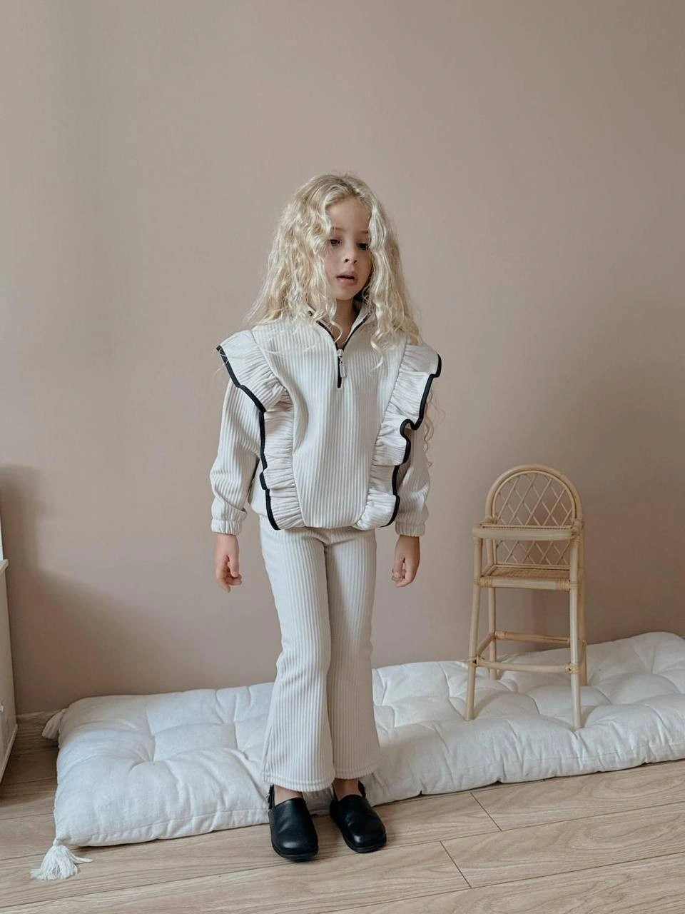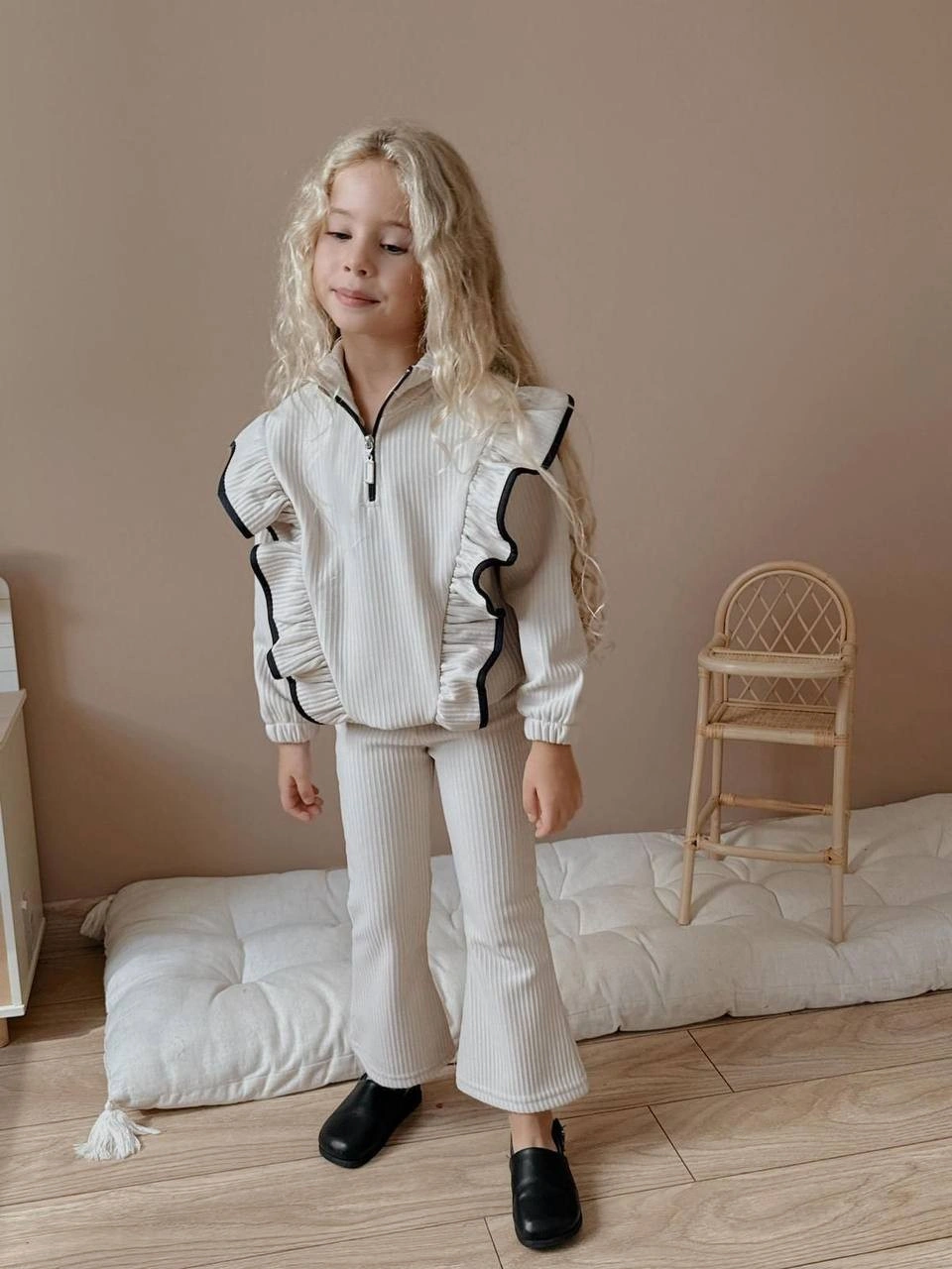 Kız Çocuk Yaka Fermuarlı Fitilli İspanyol Paça Takım Bej