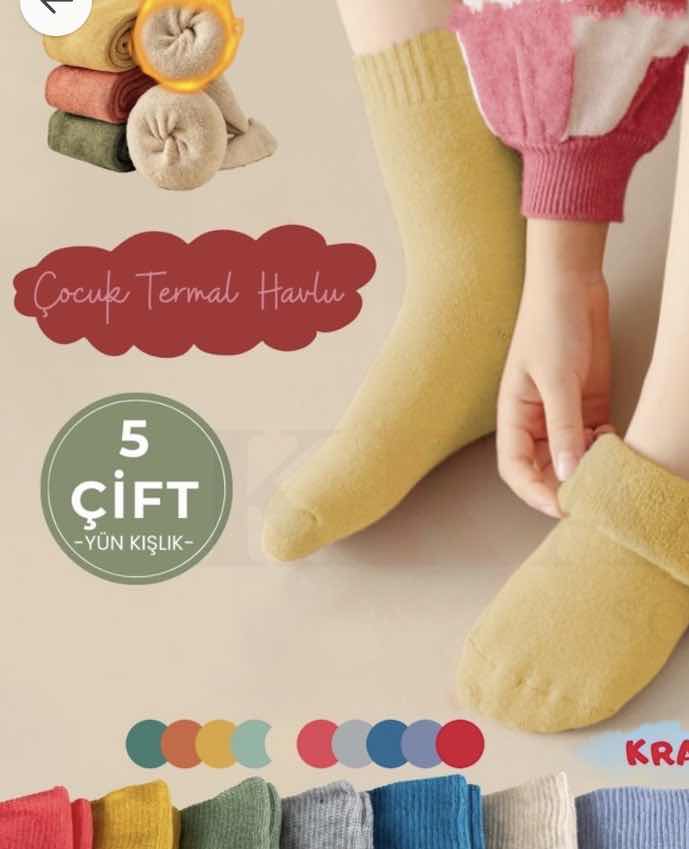 Kız - Erkek 5 Çift Çocuk Termal Çorap Kışlık Kalın Havlu Pamuklu, Renkli Set ÇoK Renkli