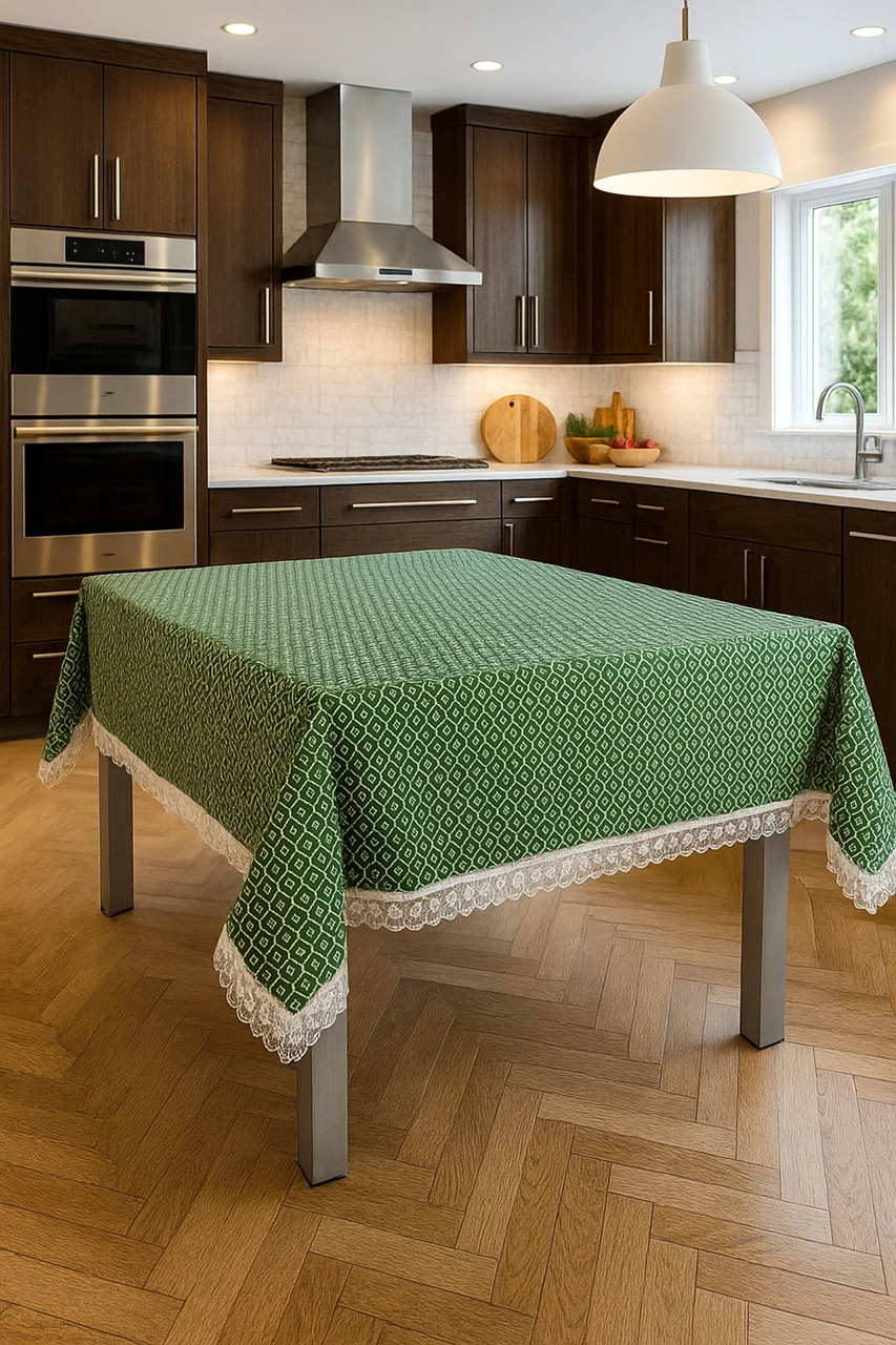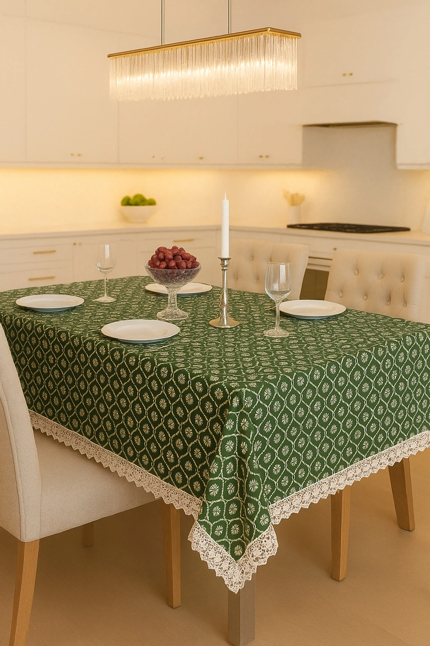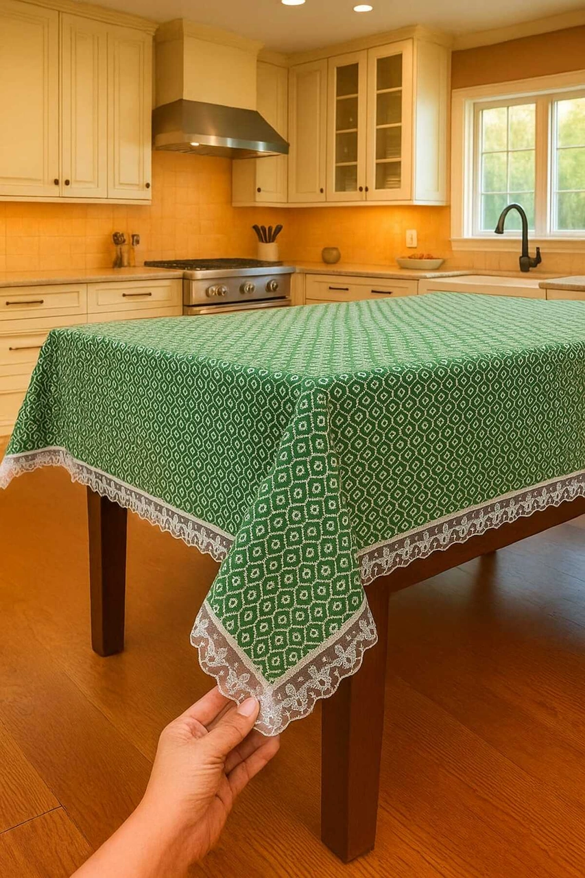 Klasik Ve Zarif Yeşil Sofra Masa Örtüsü Lüks Dantelli Kenar Detaylı Modern Şık Ve Kaliteli Kumaş Yeşil