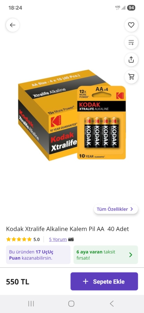 Kodak Xtralife Alkaline Kalem Pil AA 40 Adet
